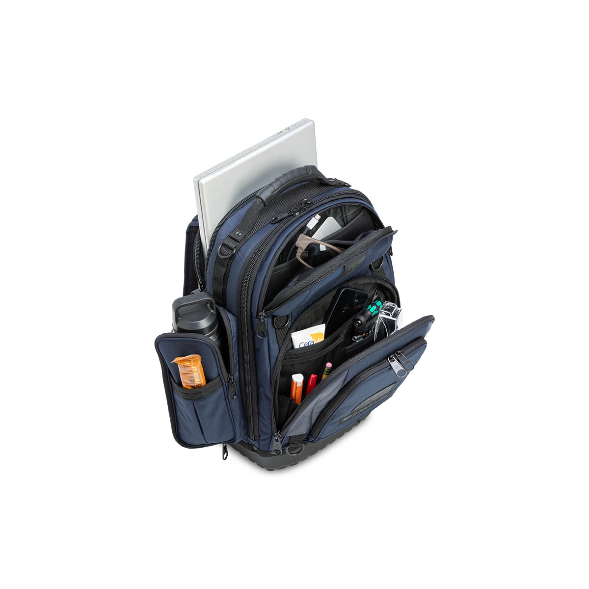 - Deux poches avant zippées supplémentaires offrent plusieurs compartiments d'organisation pour la technologie ou les objets personnels. Français À l'arrière se trouve un compartiment dédié pour ordinateur portable avec une pochette rembourrée qui peut accueillir des ordinateurs portables de 15 pouces et certains ordinateurs portables de 17 pouces.