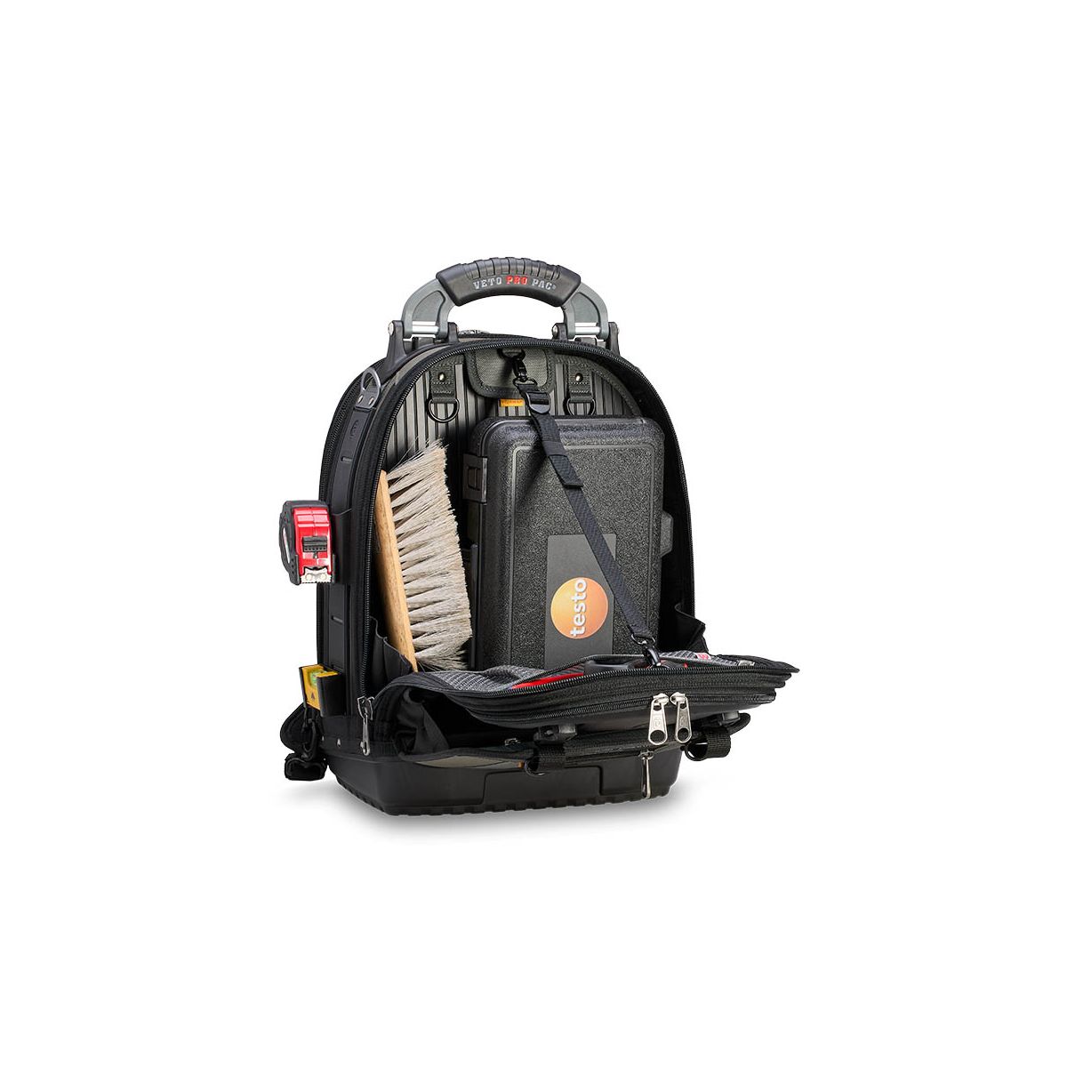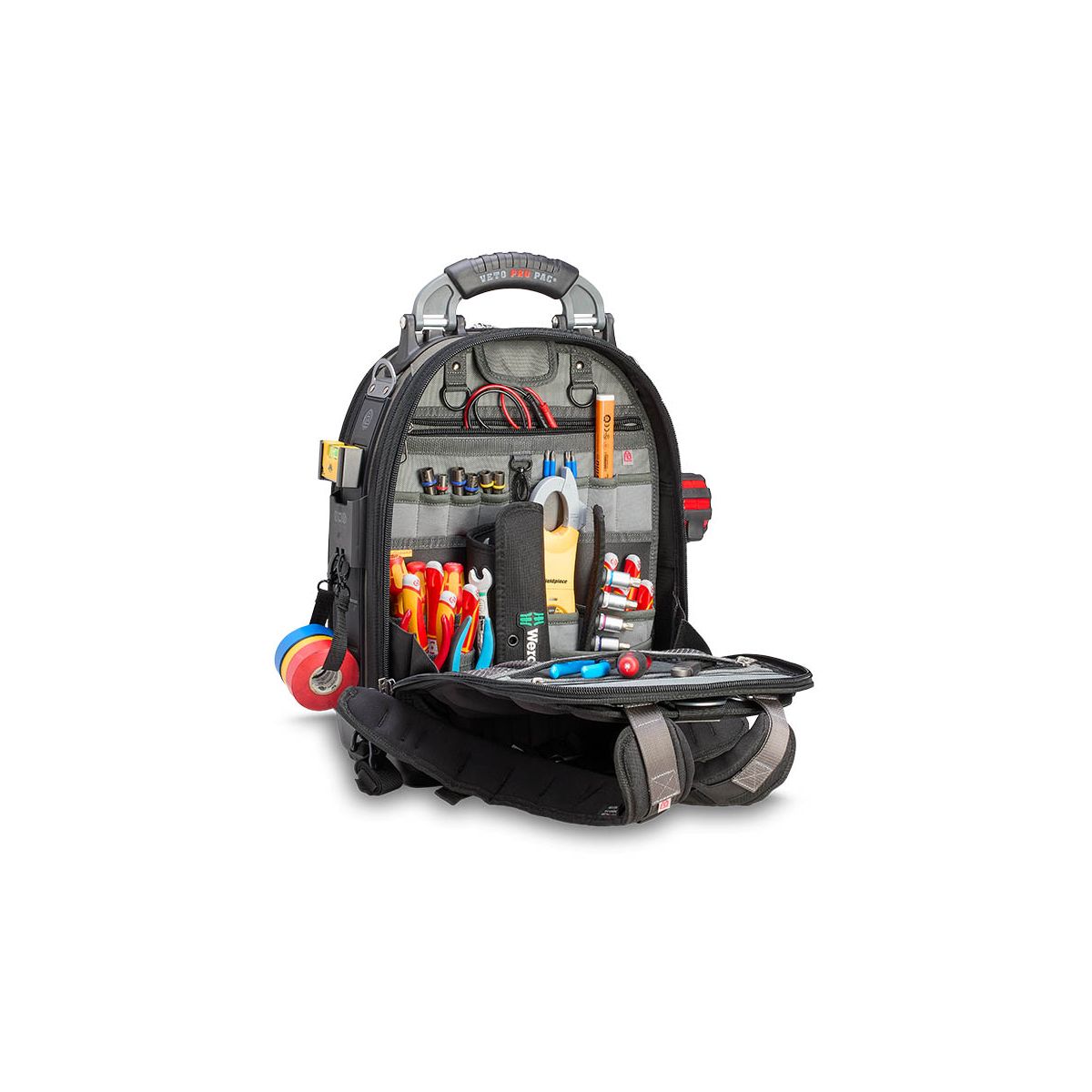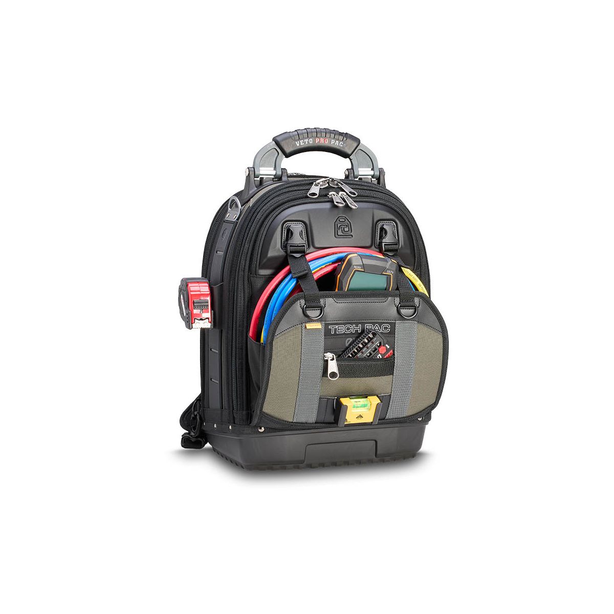 - Le TECH PAC EVO est un grand sac à dos porte-outils faisant partie du nouveau système modulaire evo system™ de Veto Pro Pac . Il comprend deux supports evo system™ permettant de fixer solidement des pochettes grâce au clip evo system™ ou d'autres accessoires munis de clips de ceinture, tels que des pochettes, des mètres ruban et des niveaux de poche, ou encore la sangle de rangement pour ruban isolant fournie. Le sac est également doté de deux bandes MOLLE verticales moulées pour des points de fixation supplémentaires, d'une poche avant thermoformée robuste, d'une poche extérieure pour manomètre et tuyau, d'un passage pour poignée de trolley et de bretelles de sac à dos amovibles haut de gamme, rembourrées et renforcées pour une durabilité et un confort accrus. Le TECH PAC EVO intègre également le système exclusif V-SWAP™ de panneaux interchangeables de Veto Pro Pac et est livré avec le panneau porte-outils et le panneau porte-mètre. Des panneaux supplémentaires sont vendus séparément, permettant ainsi différentes configurations pour le rangement d'outils, d'équipements ou pour des solutions de rangement spécifiques à chaque tâche.