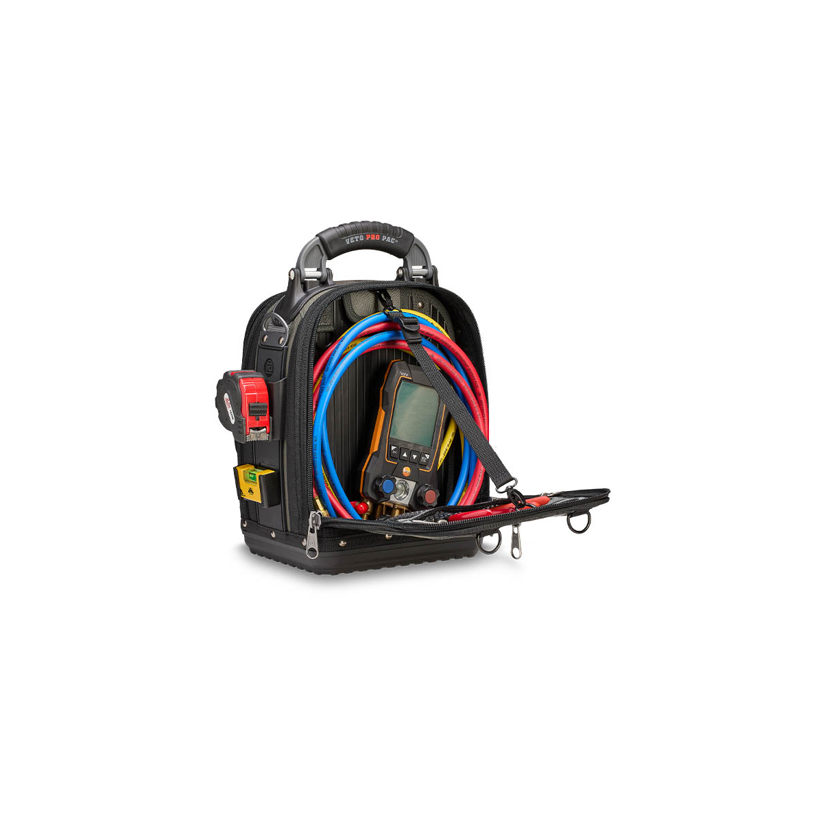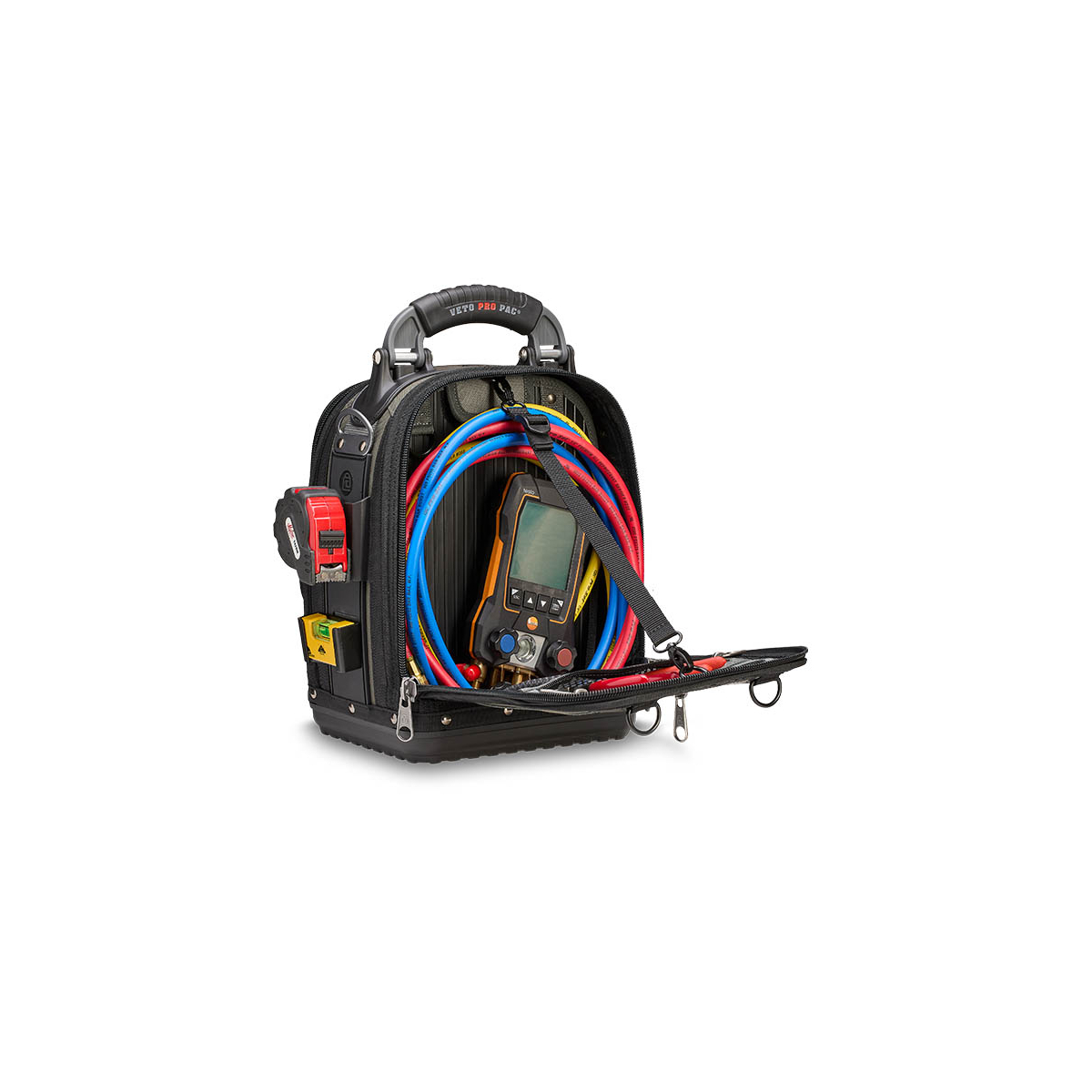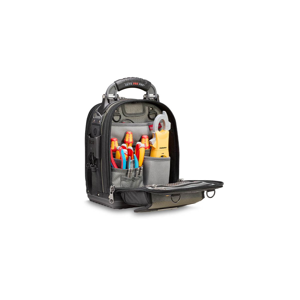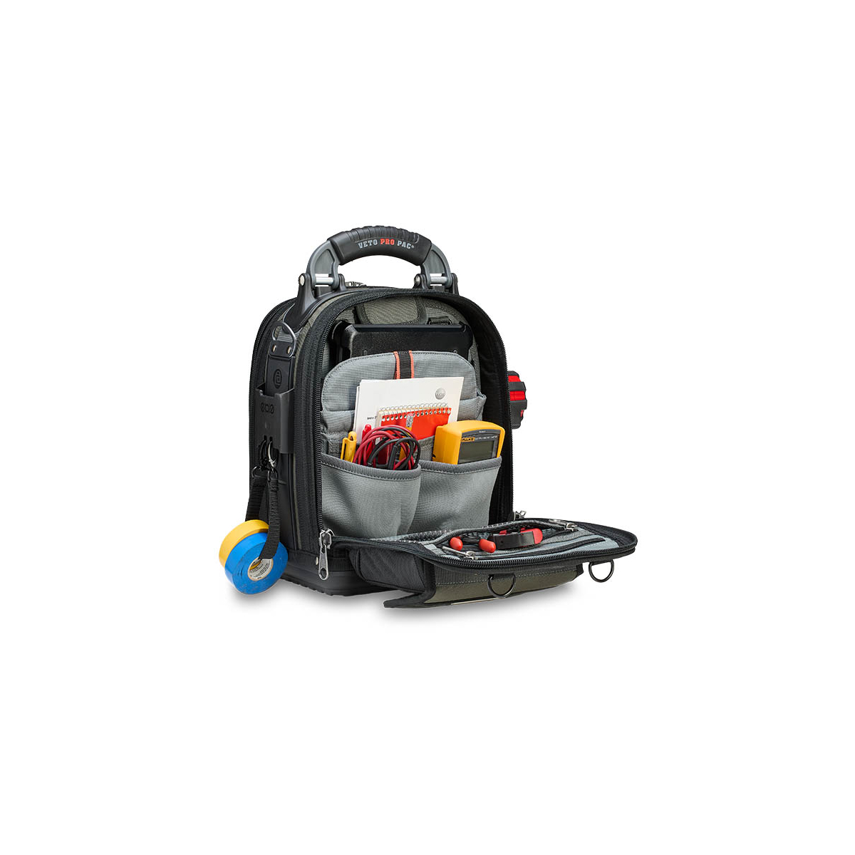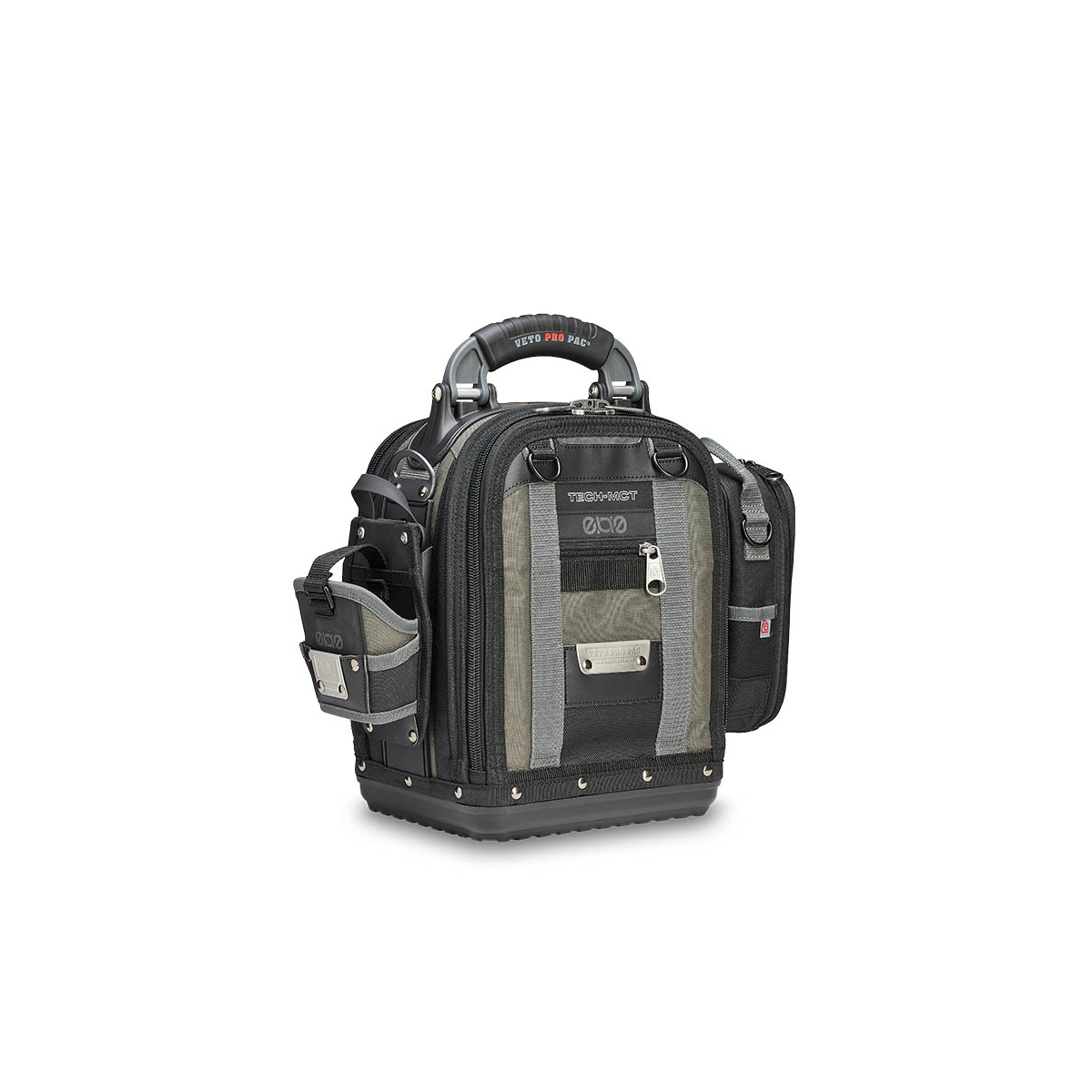 - Le TECH-MCT EVO est un sac à outils compact faisant partie du nouveau système modulaire evo system™ de Veto Pro Pac. Il comprend deux supports evo system™ permettant de fixer solidement des pochettes grâce au clip evo system™ ou d'autres accessoires munis de clips de ceinture, tels que des pochettes, des mètres ruban, des niveaux de poche ou la sangle pour ruban isolant fournie. Le sac est également doté de deux bandes MOLLE verticales moulées offrant des points de fixation supplémentaires et d'une grande poche Velcro pour ranger des éléments comme une boîte à pièces, des sondes, des gants ou d'autres accessoires.