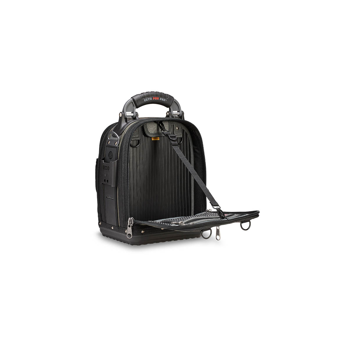 - Le TECH-MCT EVO intègre également le système exclusif V-SWAP™ de panneaux interchangeables de Veto Pro Pac et est livré avec le panneau porte-outils et le panneau porte-mètre. Des panneaux supplémentaires sont vendus séparément, permettant ainsi différentes configurations pour le rangement d'outils, d'équipements ou pour des solutions de rangement spécifiques à chaque tâche.
