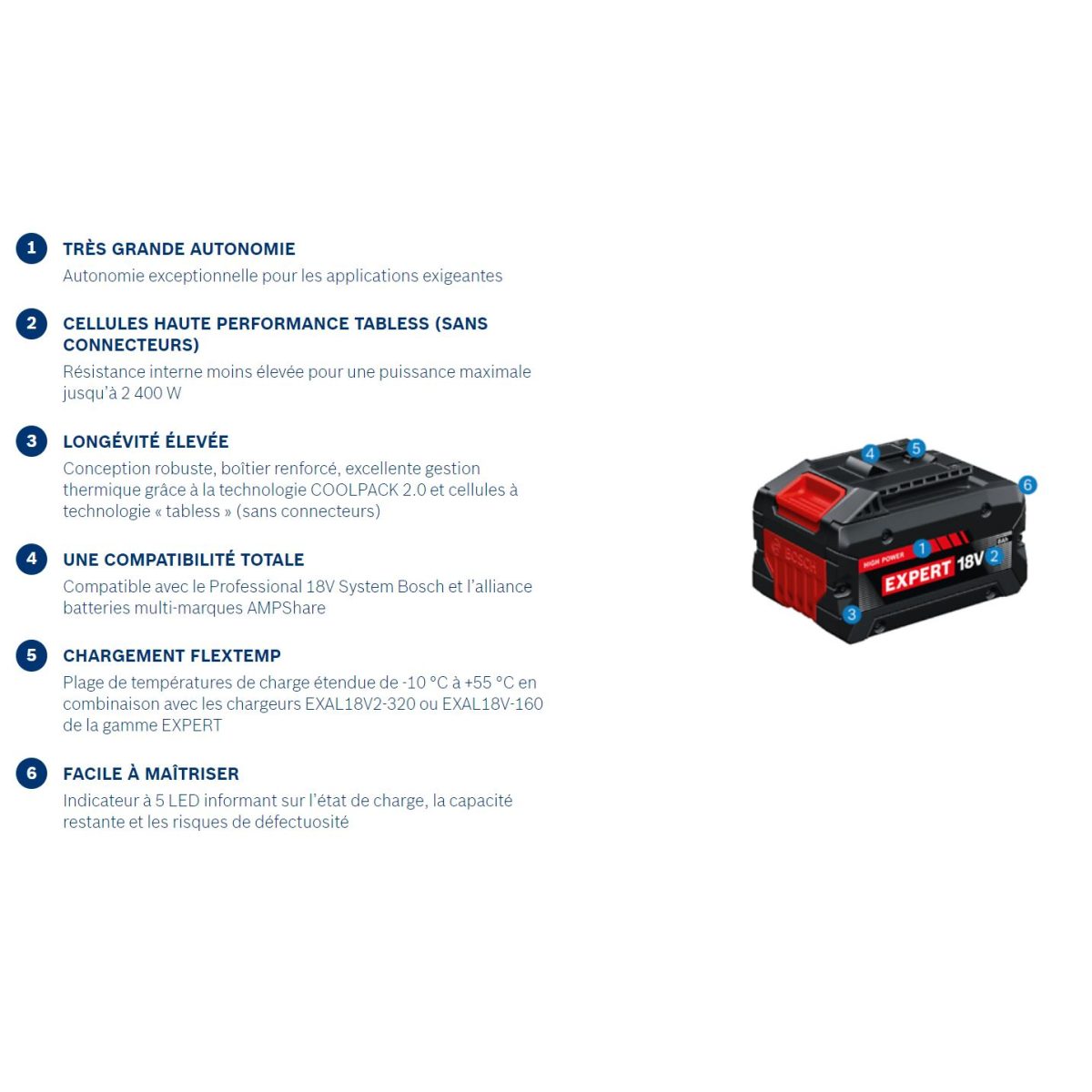 - La batterie hautes performances EXBA18V-80 de la gamme Expert offre 120 % d’autonomie en plus, ce qui permet de travailler en continu pendant une durée exceptionnellement longue, même lors d’applications exigeantes (par rapport à une batterie GBA 18V 4.0Ah ; données issues de tests internes en laboratoire ; meulage d’acier avec une GWS 18V-15 S + disque à lamelles, durées de meulage de 30s entrecoupées de pauses de 5s). Elle est dotée de cellules « tabless » (sans connecteurs) permettant de disposer jusqu’à 2 400 W de puissance maximale (données issues de tests internes en laboratoire ; puissance maximale instantanée avec une batterie neuve entièrement chargée). Dotée d’un boîtier renforcé très robuste, de la technologie COOLPACK 2.0 assurant une excellente gestion thermique et de cellules « tabless » (sans connecteurs), l’EXBA18V-80 a une longue durée de vie et est idéale pour les professionnels souhaitant concilier durabilité et performance. Le chargeur ultra rapide EXAL18V-160 ne met que 39 minutes à recharger complètement une batterie EXBA18V-80 grâce à un courant de charge de 16 A. L’Active Air Cooling 2.0 intelligent refroidit les batteries efficacement et le chargement FlexTemp étend la plage de températures de charge des batteries EXPERT (-10°C à +55°C). Ces deux fonctions réduisent les durées d’immobilisation en permettant de recharger aussitôt des batteries encore chaudes, même après des utilisations très intensives. Le chargement FlexTemp permet aussi de recharger des batteries très froides et très chaudes.