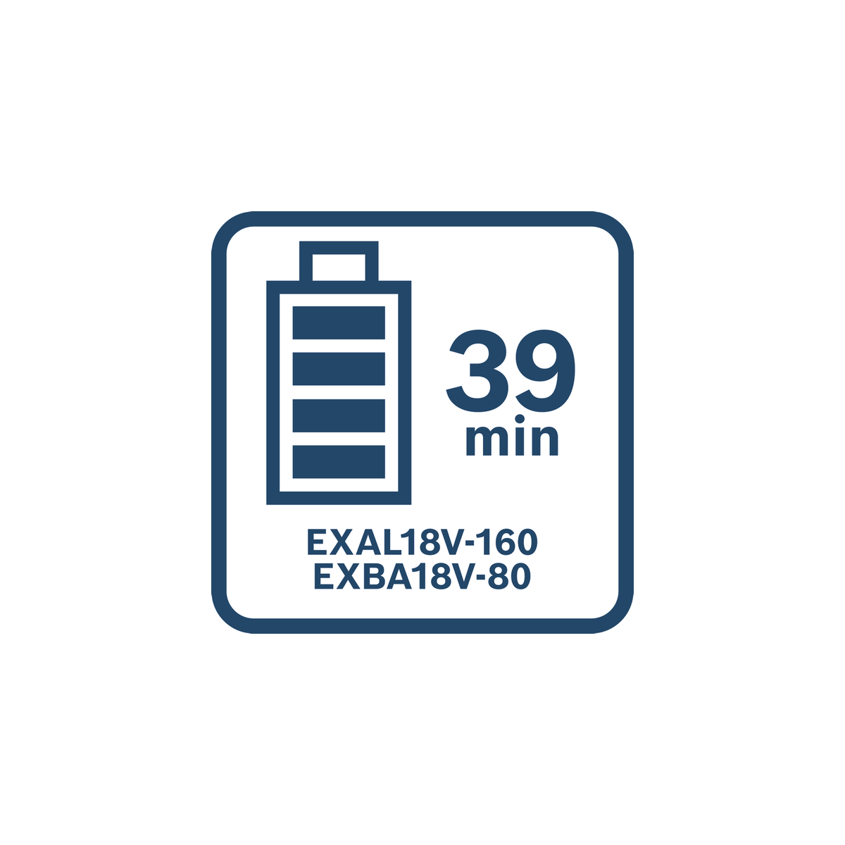 - La batterie EXBA 18V-80 peut être rechargée à 100 % en seulement 39 minutes avec le chargeur EXAL 18V-160 et ne pèse que 1,04 kg.