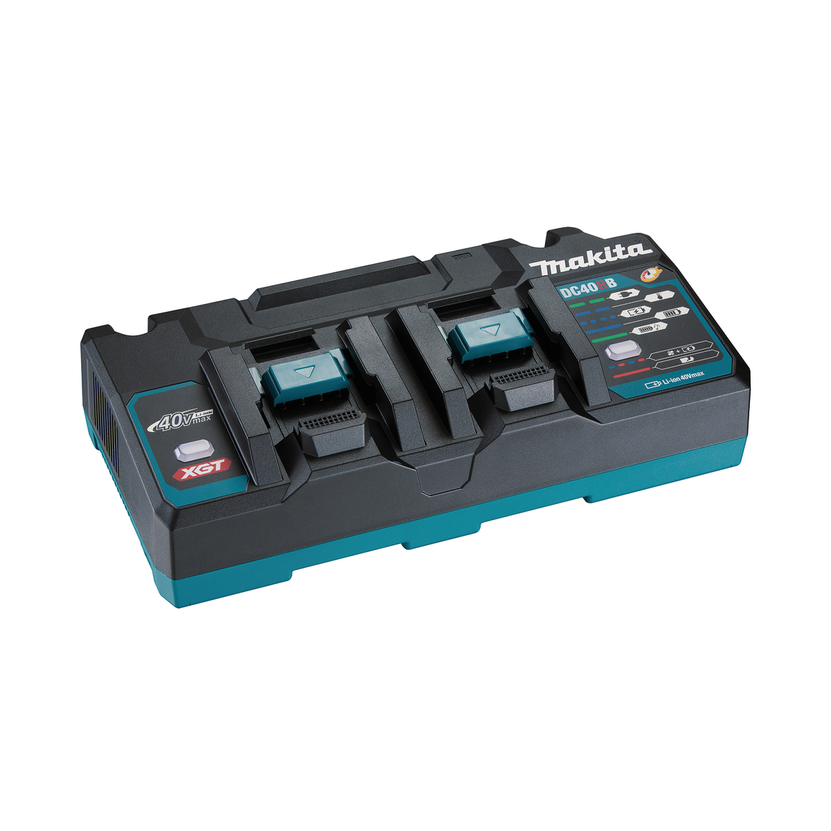 Le chargeur rapide double Makita DC40RB pour batteries 40V de la gamme XGT offre une charge de 28 à 45 minutes selon la capacité de la batterie.