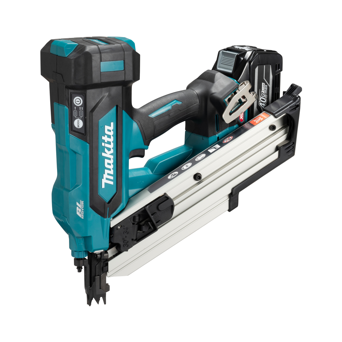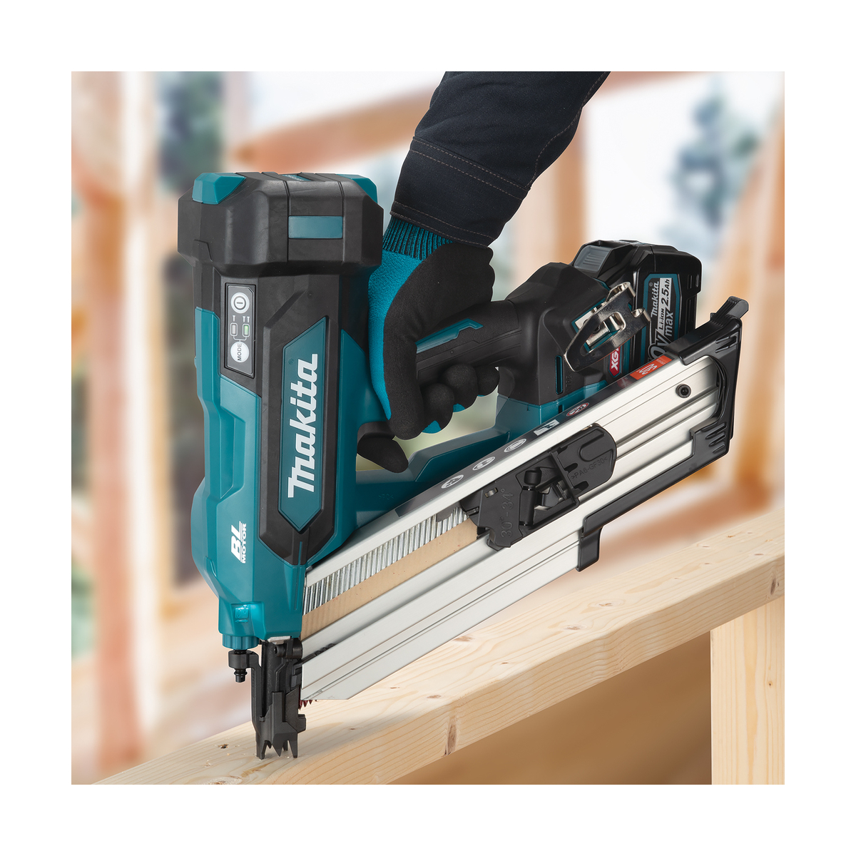 Le Makita BN001GD201 XGT 40V Max est un cloueur de construction haute performance, conçu pour l’enfoncement de pointes à tête en D de 50 à 90 mm, montées sur bande inclinée de 30° à 34°. Il est parfaitement adapté aux travaux de construction bois, pose de panneaux, ossatures et liteaux.
