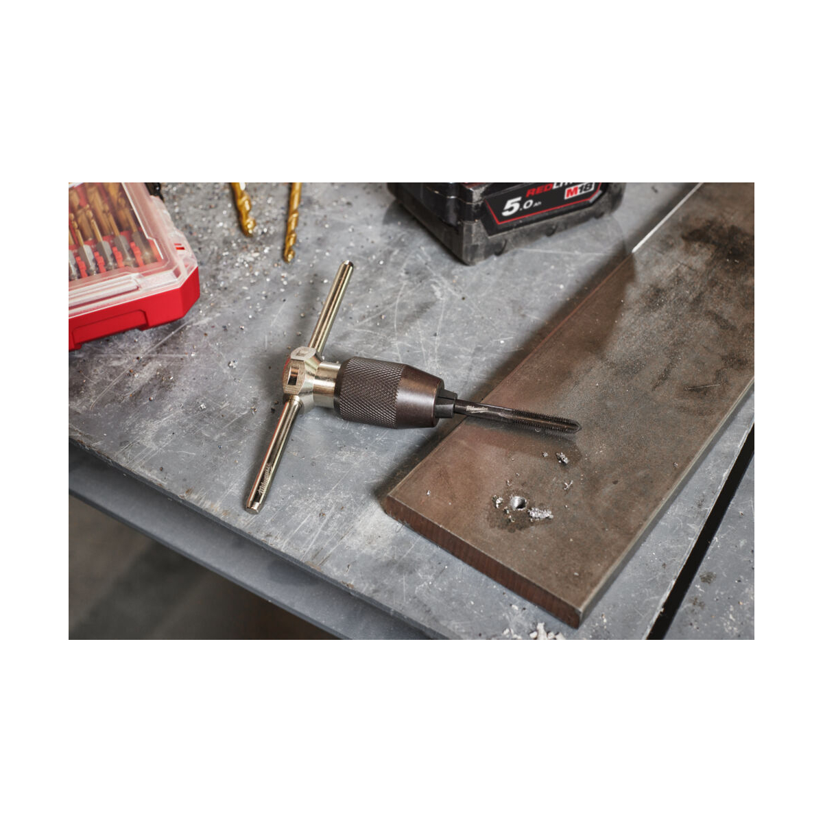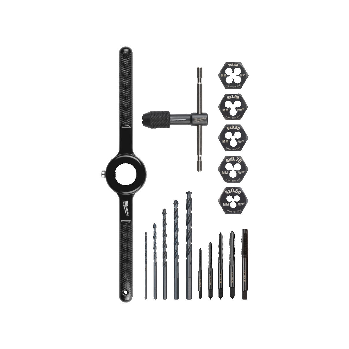- Tarauds à goujure M3-0,50 mm, M4-0,70 mm, M5-0,80 mm, M6-1,00 mm, M8, 1,25 mm / Filières hexagonales 1″ M3-0,50 mm, M4-0,70 mm, M5-0,80 mm, M6-1,00 mm, M8, 1,25 mm / Forets 2,5 mm, 3,3 mm, 4,2 mm, 5,0 mm, 6,8 mm / Poignée en T / Porte-filière hexagonale 1
