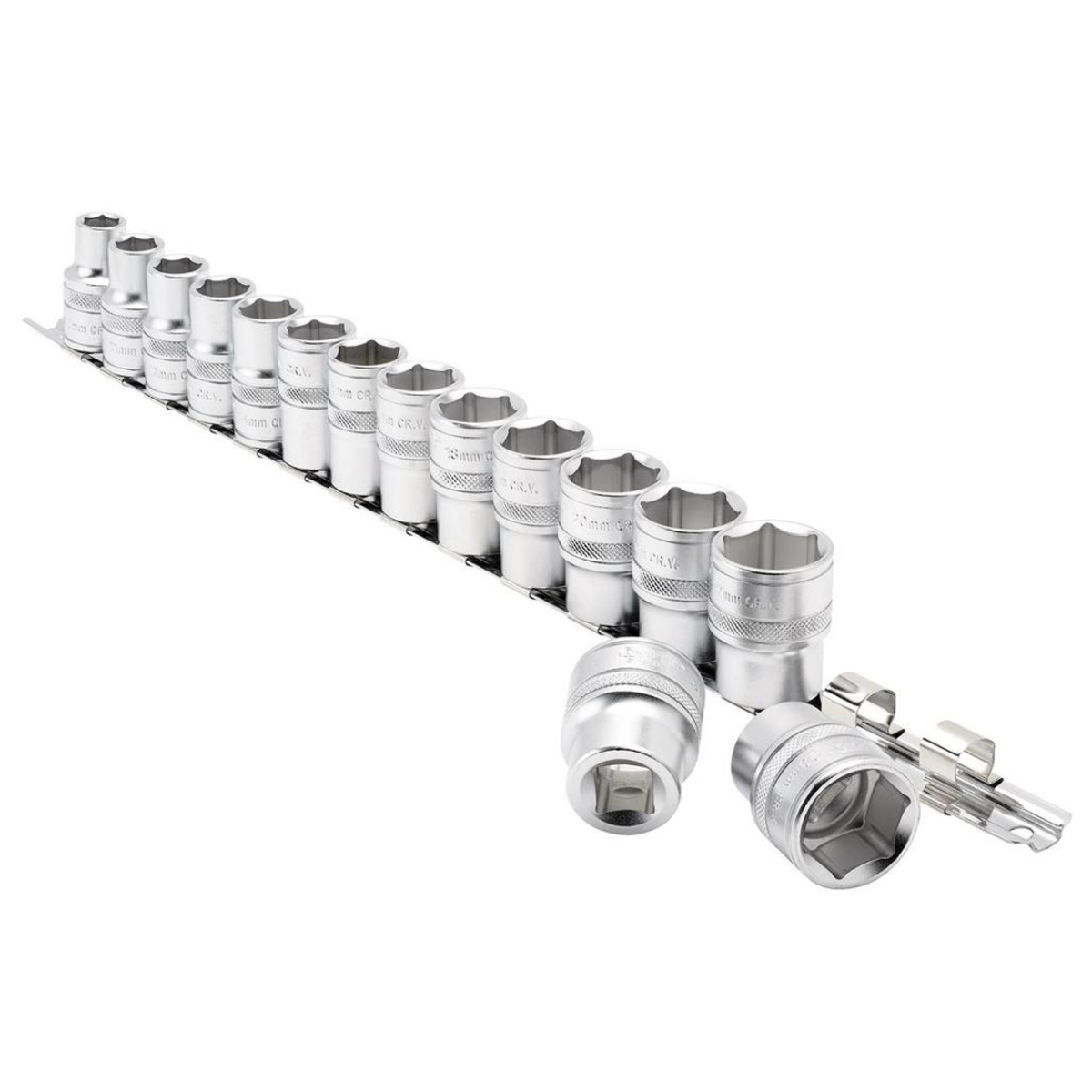 - Fabriquées en acier au chrome-vanadium trempé et revenu avec une finition micro-satinée, ces douilles sont dotées d'une bague moletée pour une meilleure prise en main. Elles sont livrées sur un rail métallique pour un rangement sécurisé.