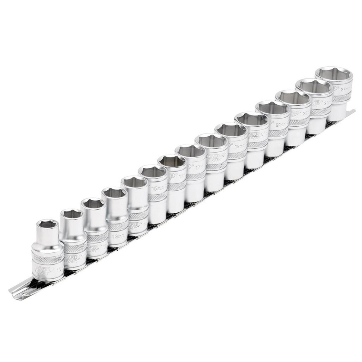 Draper Expert D16496 : Fabriquées en acier au chrome-vanadium trempé et revenu avec une finition micro-satinée, ces douilles sont dotées d'une bague moletée pour une meilleure prise en main. Elles sont livrées sur un rail métallique pour un rangement sécurisé.