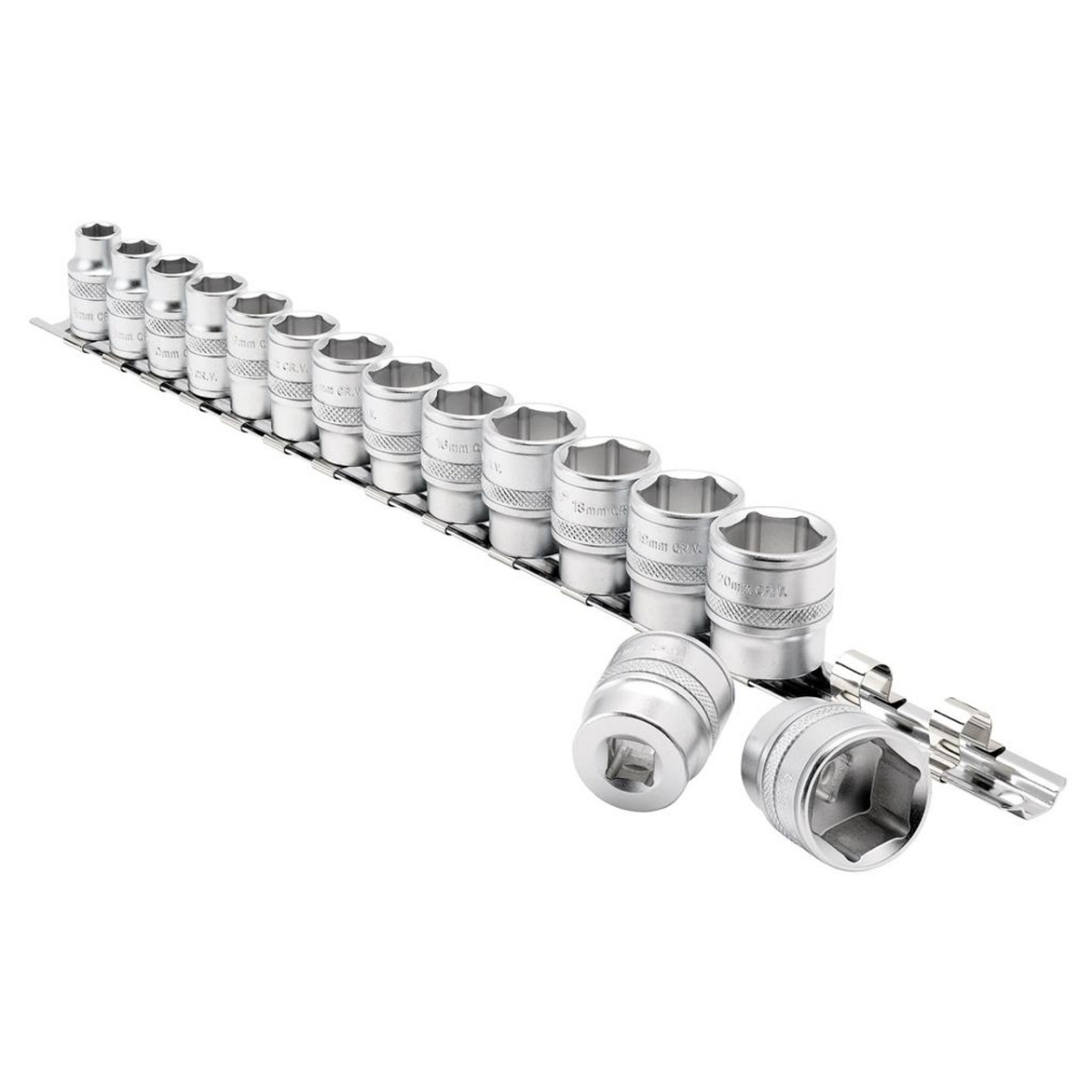 Draper Expert D16492 : Fabriquées en acier au chrome-vanadium trempé et revenu avec une finition micro-satinée, ces douilles sont dotées d'une bague moletée pour une meilleure prise en main. Elles sont livrées sur un rail métallique pour un rangement sécurisé.