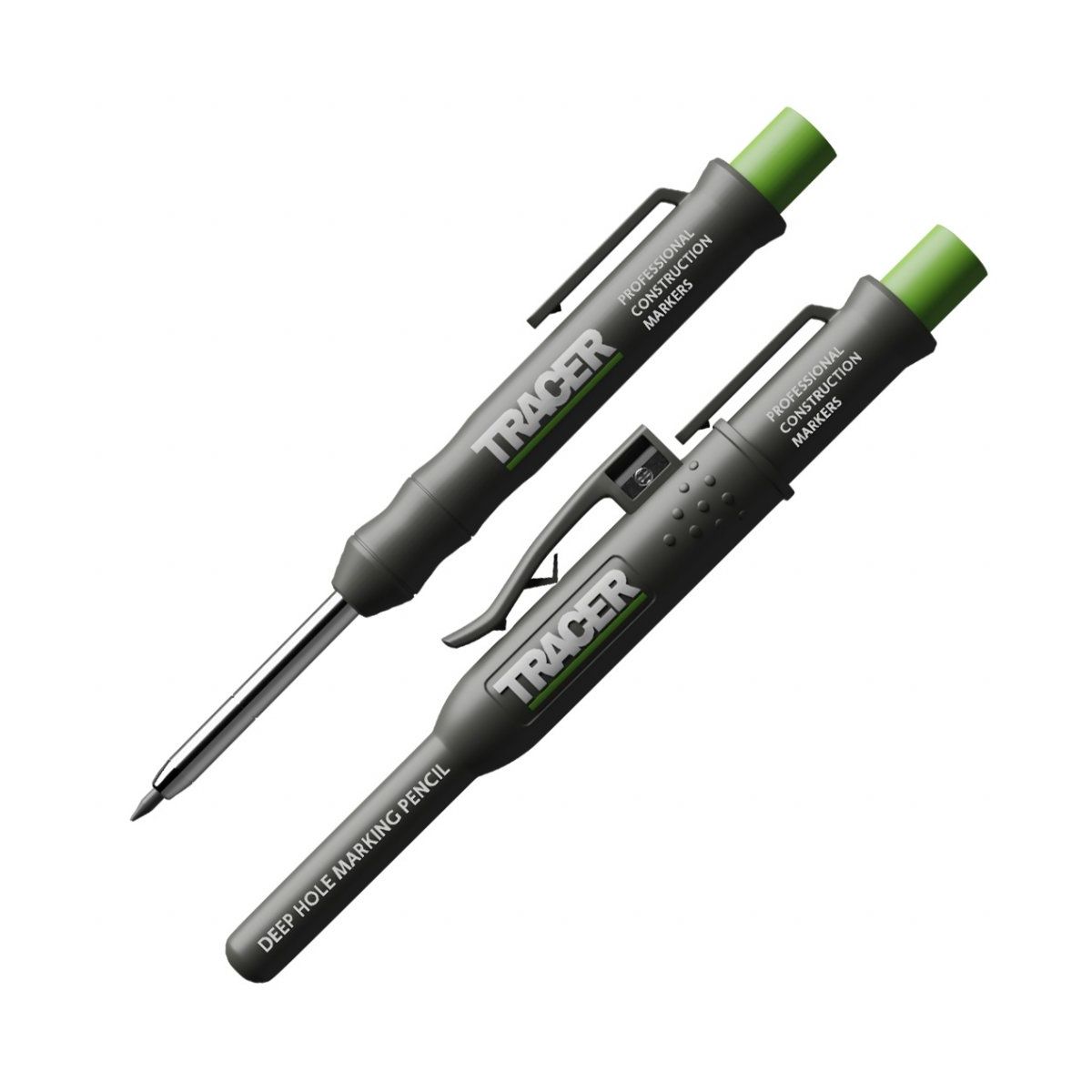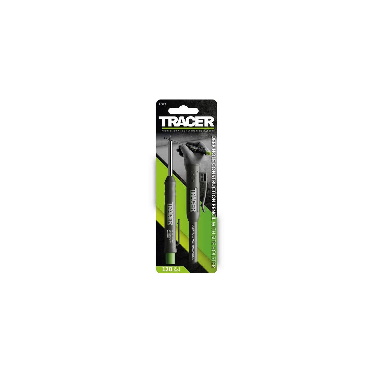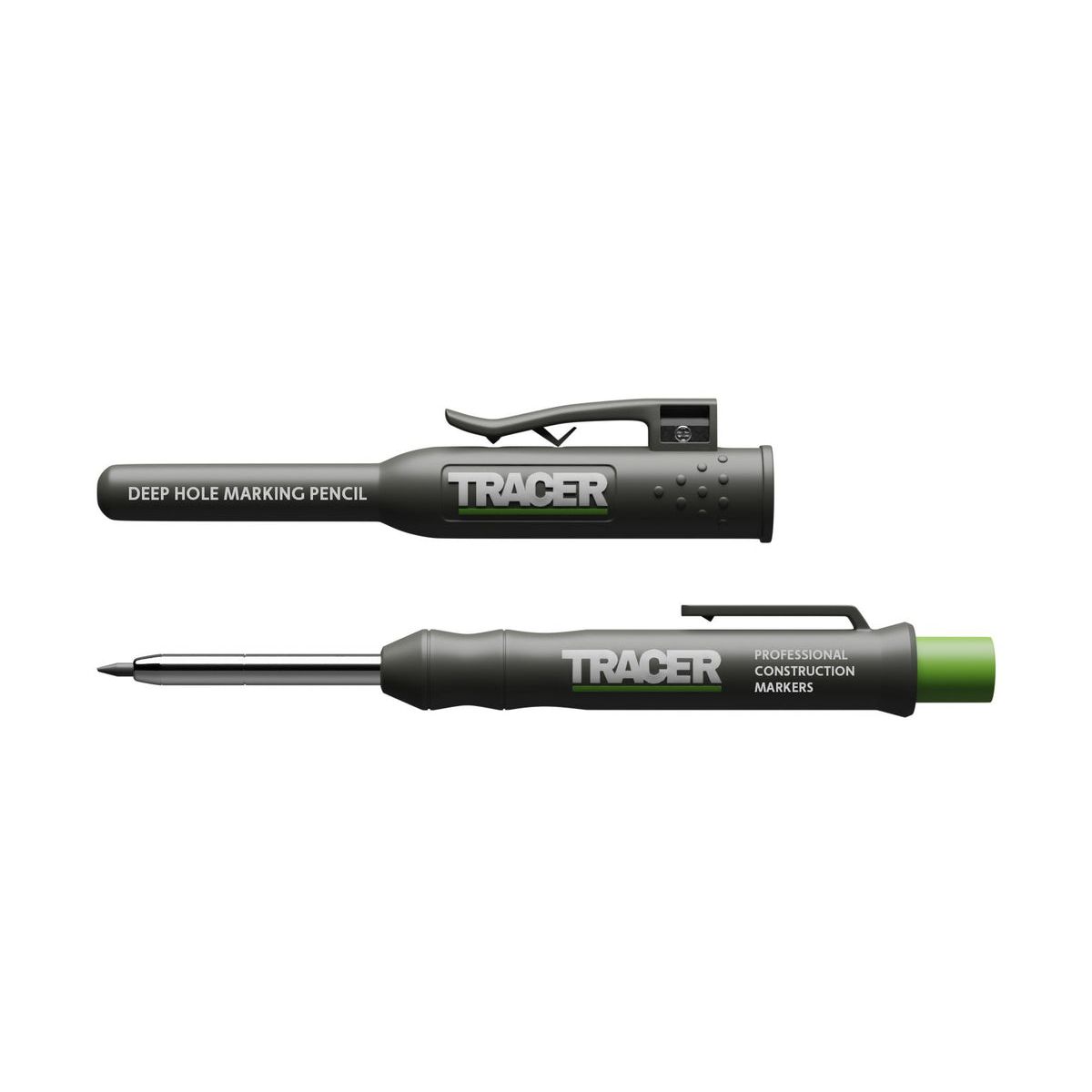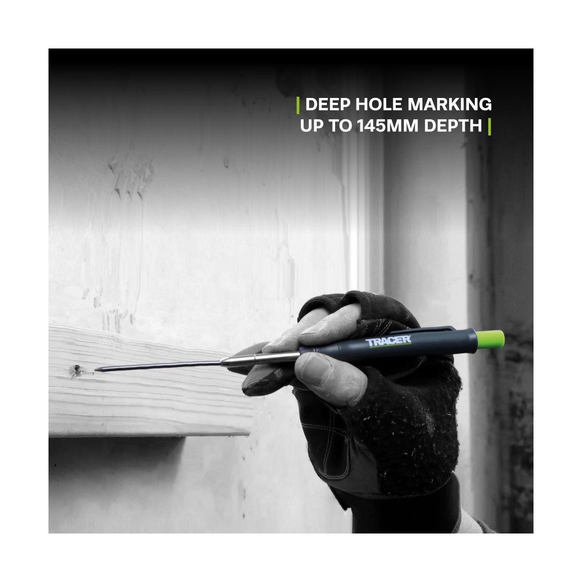 - Le marqueur à mine profonde TRACER avec étui de chantier est conçu pour offrir rapidité, praticité et précision. Destiné à un usage général dans le secteur de la construction, ce marqueur professionnel est doté d'une mine 2B extensible de 120 mm permettant de marquer jusqu'à 100 mm de profondeur dans un trou de 3 mm et jusqu'à 145 mm dans un trou de 6 mm.