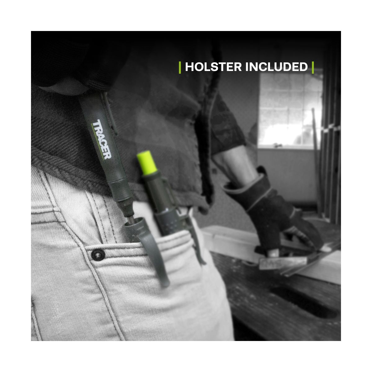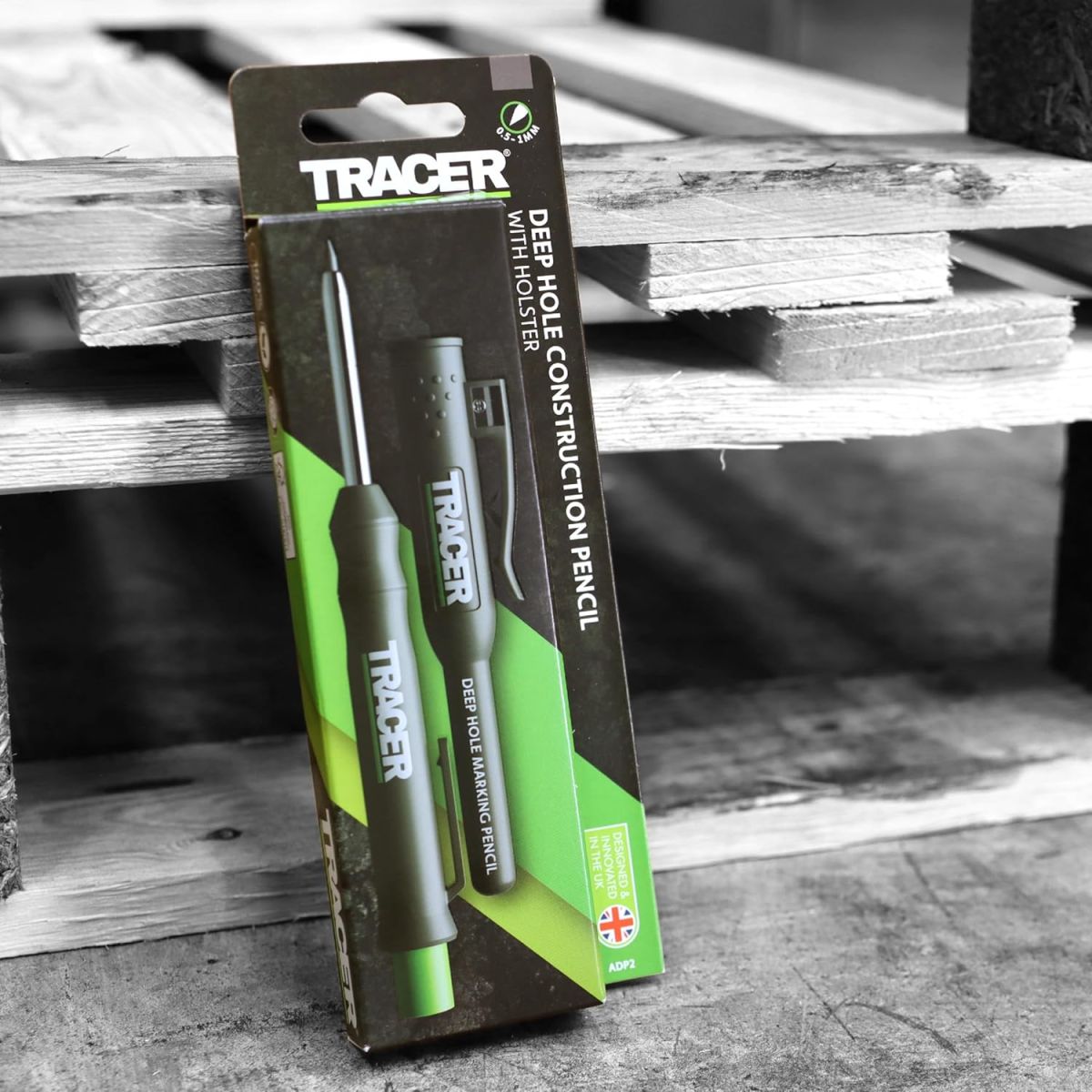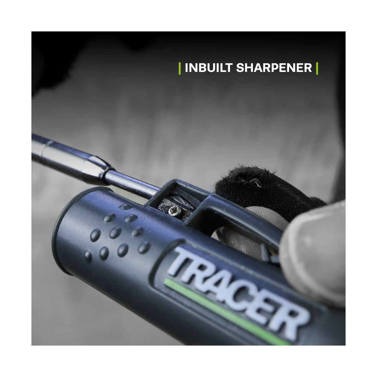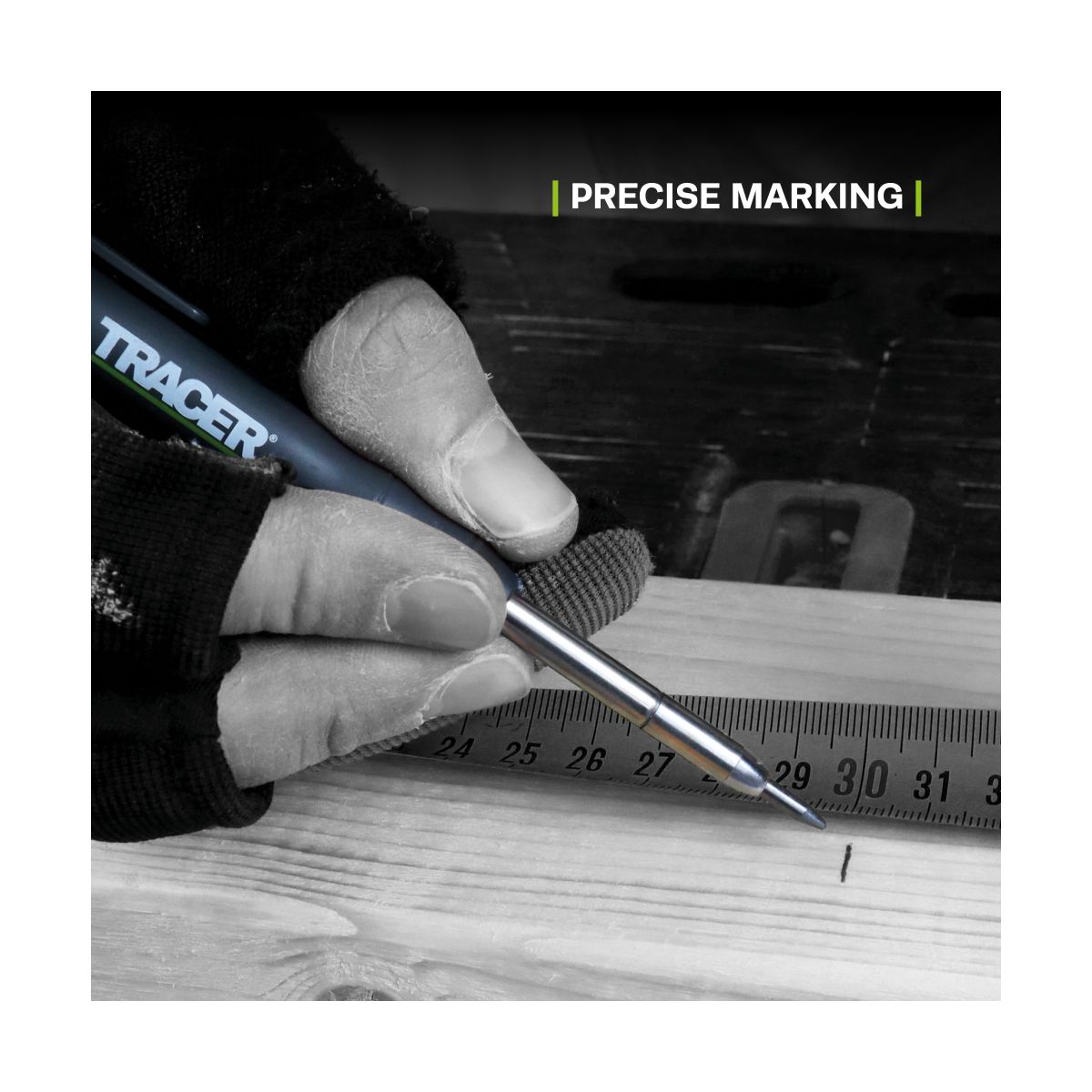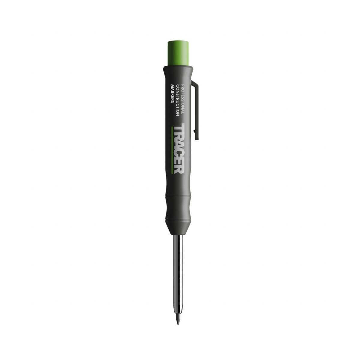 - Le marqueur à mine profonde TRACER avec étui de chantier est conçu pour offrir rapidité, praticité et précision. Destiné à un usage général dans le secteur de la construction, ce marqueur professionnel est doté d'une mine 2B extensible de 120 mm permettant de marquer jusqu'à 100 mm de profondeur dans un trou de 3 mm et jusqu'à 145 mm dans un trou de 6 mm.