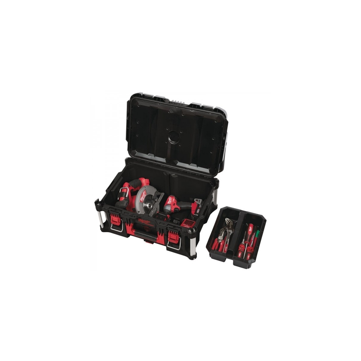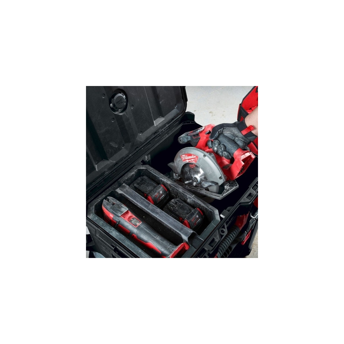 - Ce coffret de transport pour outils sans fil ou filaire de dimension 560x410x290mm fait partie de la gamme de stockage modulaire Milwaukee Packout. Construit avec des polymères résistants aux chocs pour la durabilité du chantier il est équipée de joint d'étanchéité pour protéger contre la pluie et la poussière (Norme IP65). Les coins sont renforcés en métal et les points de verrouillage renforcé en métal. Un plateau organisateur intérieur est présent ainsi que pour le Milwaukee ONE-KEY TICK.
