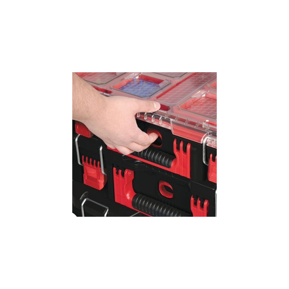- Cet organisateur Milwaukee fait partie du système de stockage modulaire Packout compatible avec les organisateur, sac à outils et coffret de rangement pour outils de type HD Box. Construit avec polymères résistants aux chocs pour la durabilité du chantier, cette organisateur comporte 10 bacs amovibles et montables qui peuvent être montés sur des matériaux de chantier courants pour un accès facile.