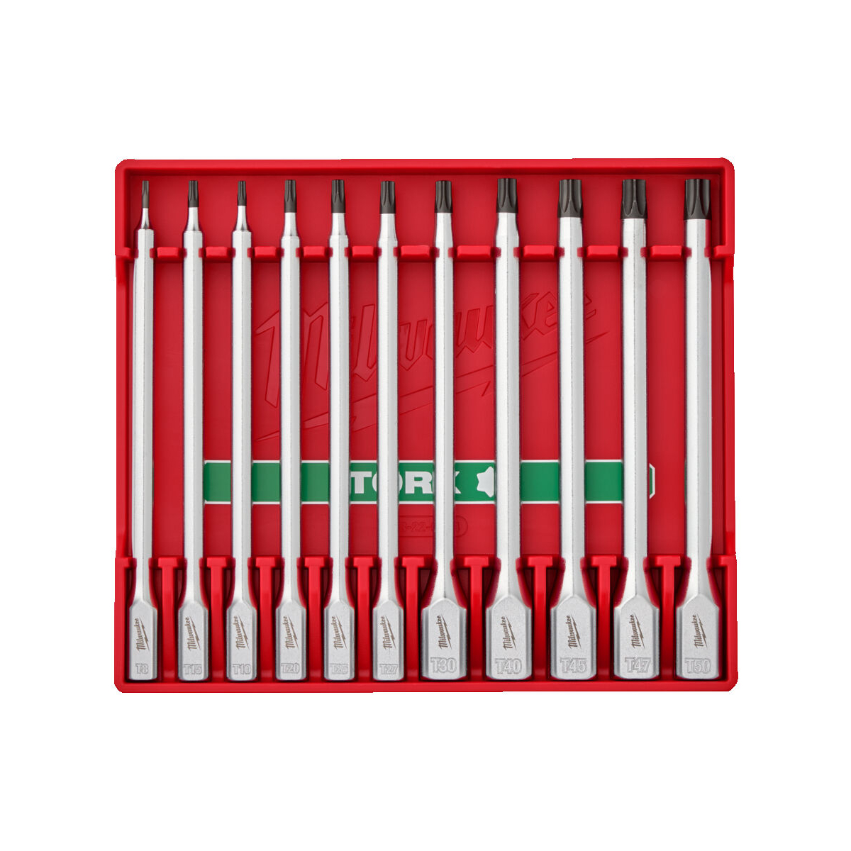 Set de 11 douilles emboutstorx longs professionnelles avec support de marque Milwaukee pour cliquet 1/4" & 3/8".