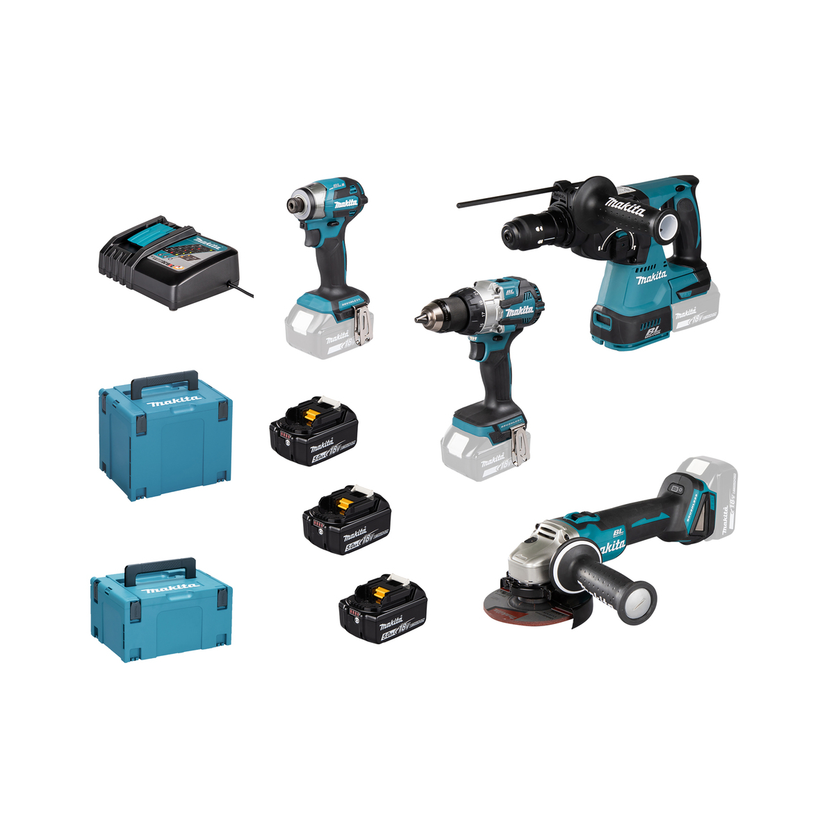 - Ensemble de 4 machines MAKITA à batterie Li-Ion : une perceuse visseuse DHP489, une visseuse à chocs DTD173, un perforateur DHR243 et une meuleuse DGA504. Livré avec x3 batteries 18V de 5.0Ah.