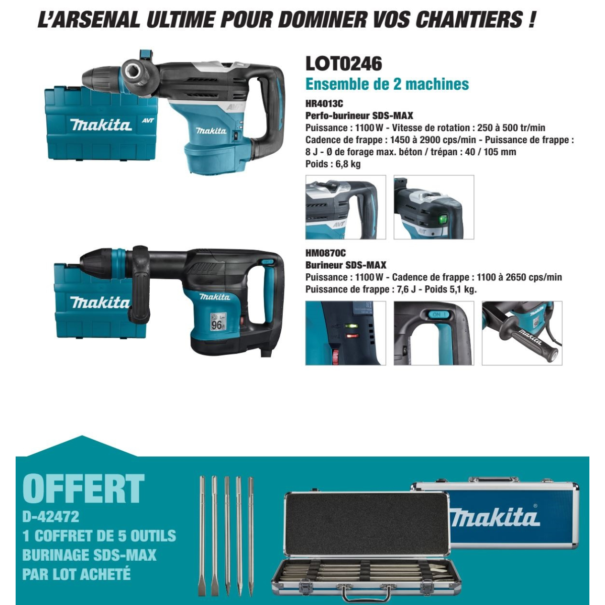 - Cet ensemble de 2 machines Makita LOT0246 comprend 1 Perforateur-burineur HR4013 d'une puissance de frappe de 8 Joules et un burineur HM0870C d'une puissance de frappe 7.6 Joules.