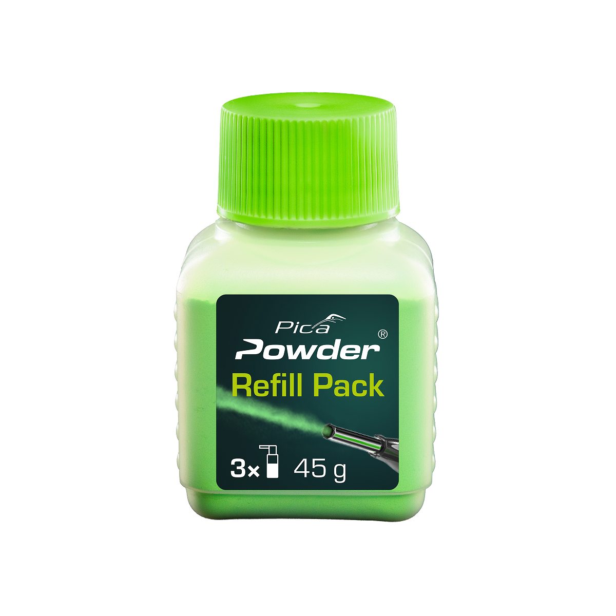 Recharge de poudre verte fluorescente pour le marqueur en spray sans contact PICA POWDER 2020. La recharge prolonge la durée de vie du Pica Powders - complètement sans gaz propulseur. Le mécanisme de pompe robuste avec Gaz zéro permet un remplissage facile tout en préservant l'environnement.