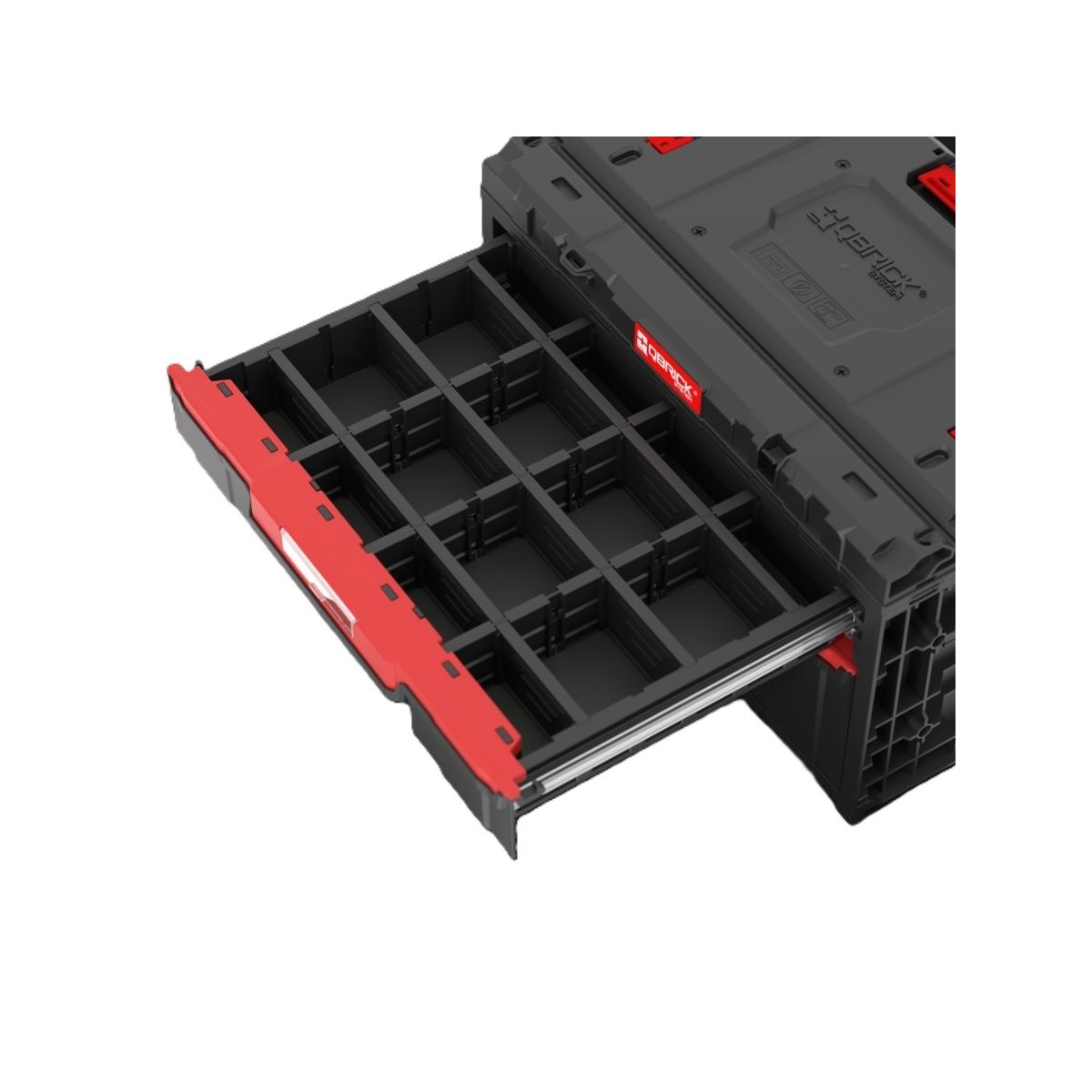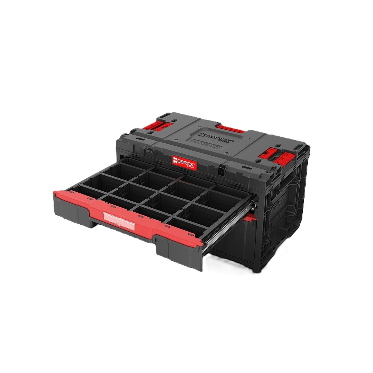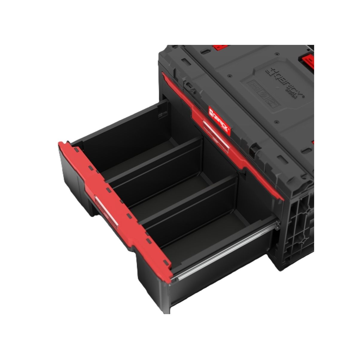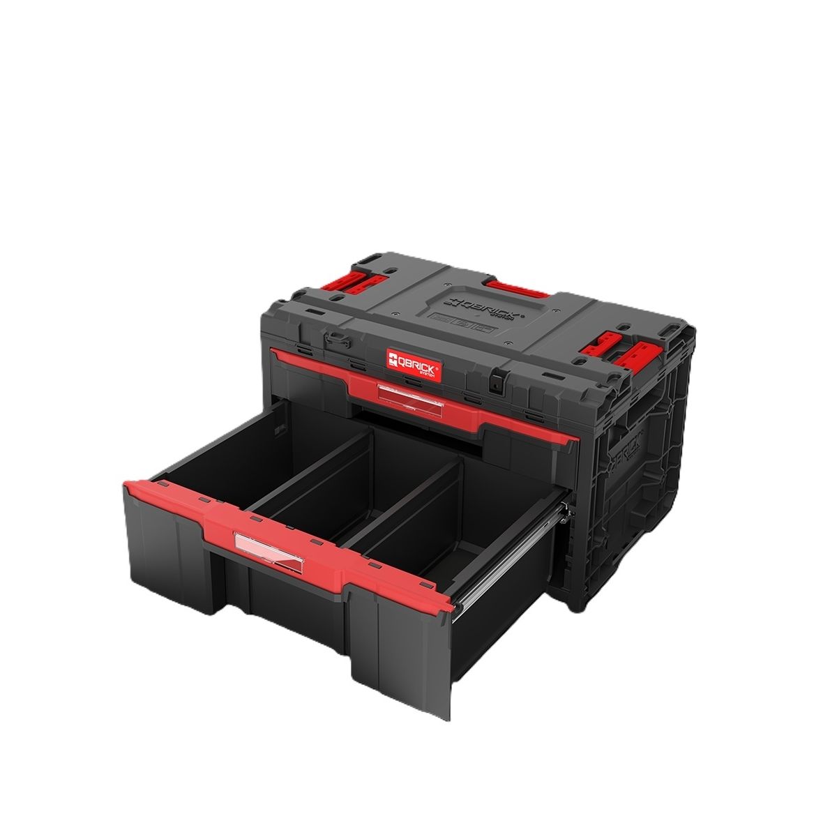 - Qbrick System ONE Drawer 2 Plus Toolbox est une boîte à outils très spacieuse et modulaire. Equipé de deux tiroirs coulissant sur guides métalliques. Un bouton pratique permet d’accéder facilement à leur contenu. Les tiroirs bas et hauts sont équipés de séparateurs réglables en ABS. Tiroir bas avec 3 compartiments longs et 8 courts, tiroir haut avec 2 compartiments longs. Les connecteurs latéraux en polyamide permettent une connexion facile avec d’autres modules de la gamme ONE. Le couvercle Vario permet également de connecter le tiroir au système PRO. Des poignées latérales confortables dans le corps assurent un transport pratique du module. L’identification de l’outil est assurée par un emplacement pour étiquette protégé par un cache en polycarbonate. Les corps adaptés au montage d’inserts filetés de taille M8 permettent toute personnalisation du système en fonction des besoins de l’utilisateur.