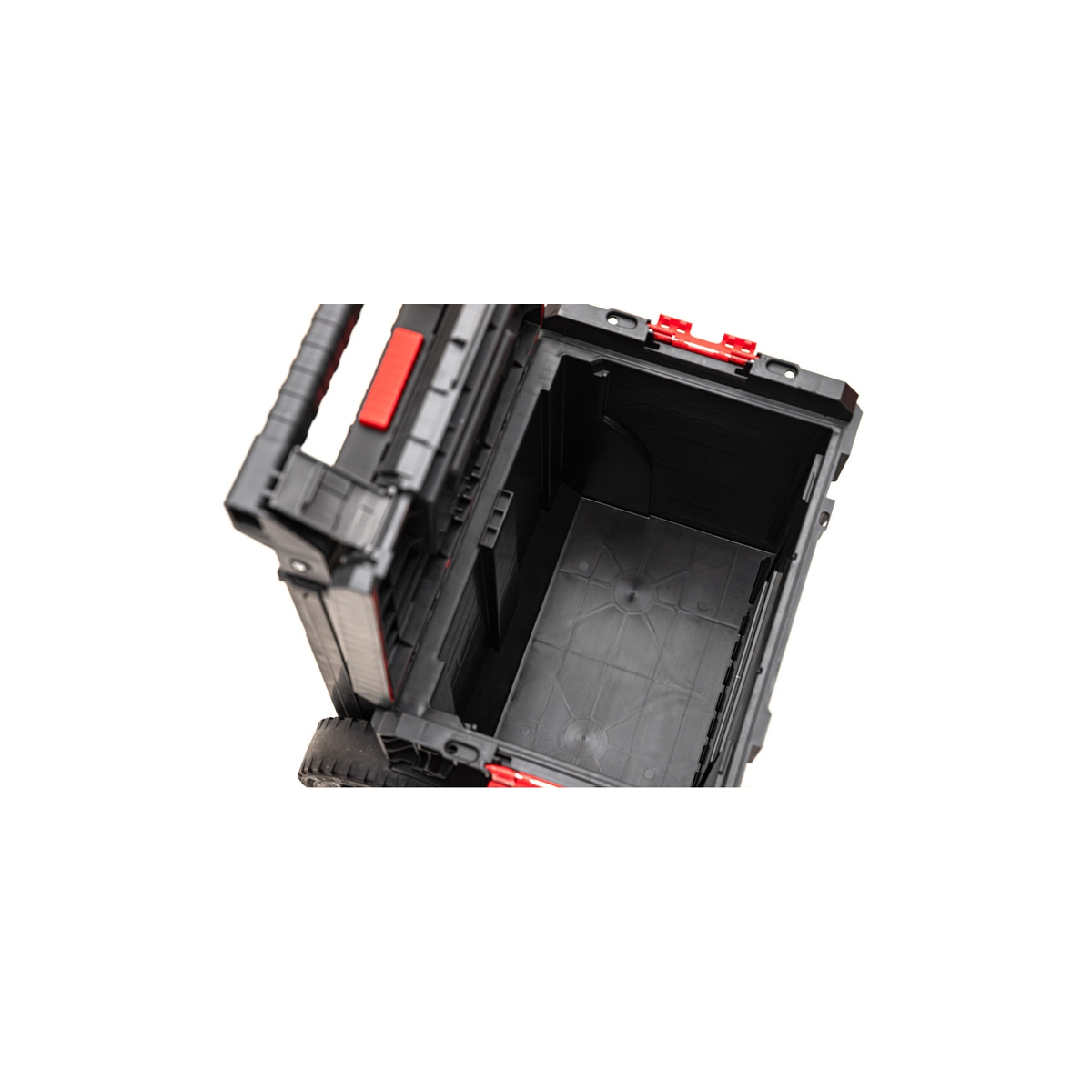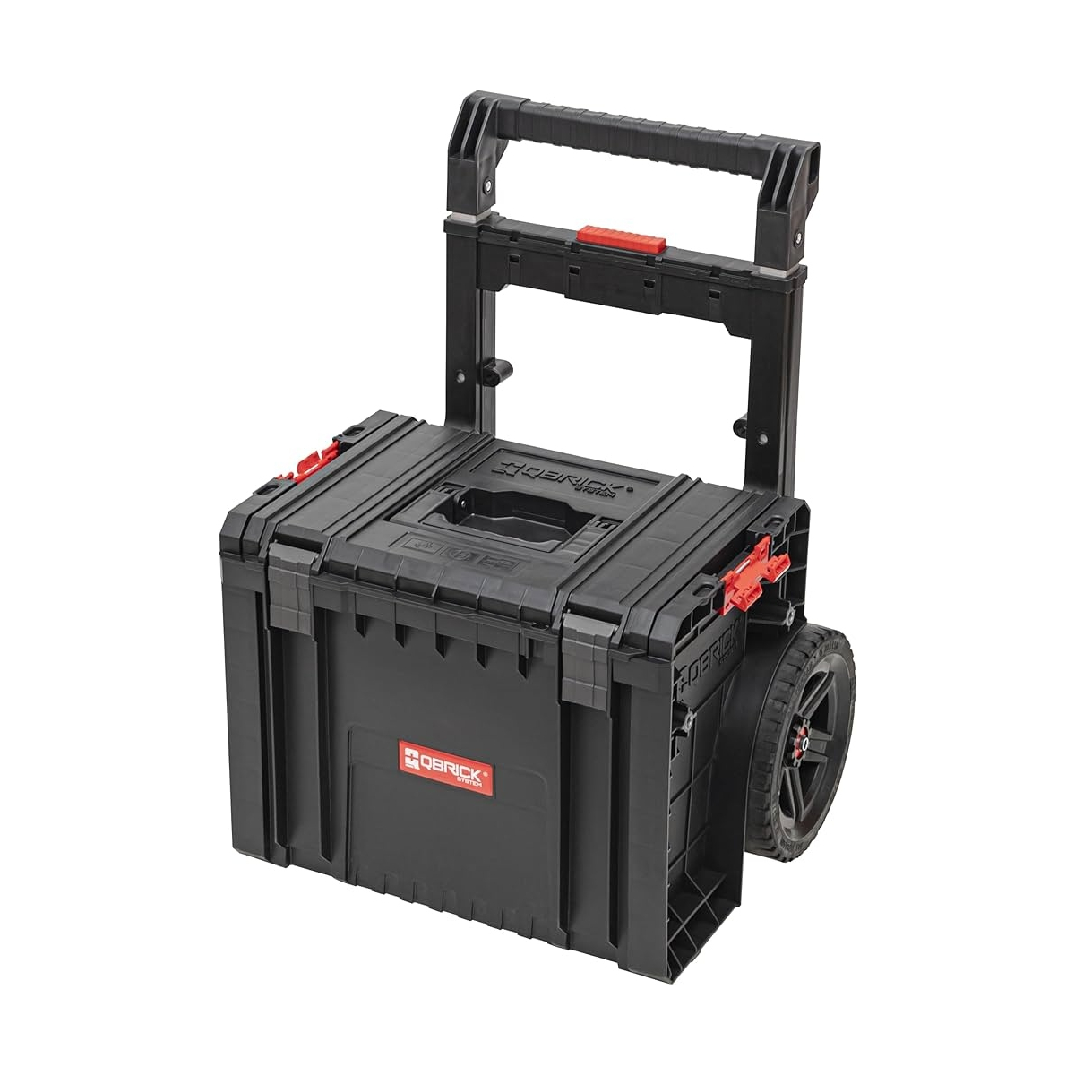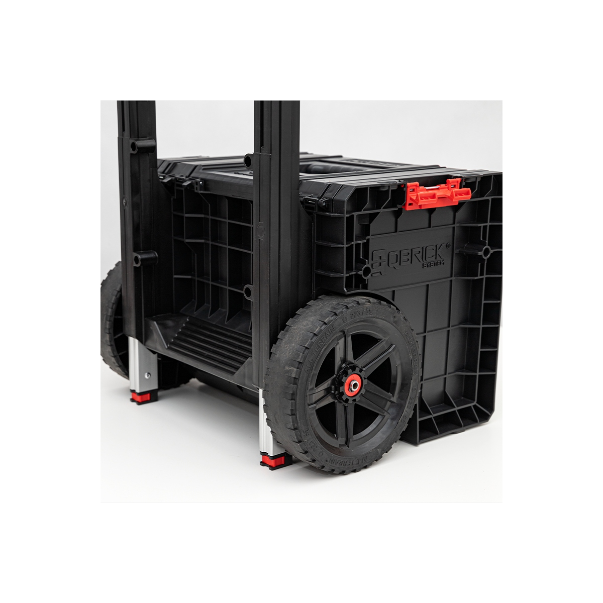 - Qbrick System PRO Cart 2.0 Plus est un boîtier mobile sur roulettes. Équipé d’une double poignée télescopique amovible et d’une plateforme de pied confortable permettant une prise ferme et des manœuvres faciles dans une zone relativement petite. Les grandes roues de 9 pouces, d’une largeur de près de 6 cm, sont recouvertes d’une épaisse couche de caoutchouc, qui assure une traction sans problème même dans les conditions les plus difficiles. De plus, des attaches solides et des connecteurs latéraux en polyamide résistant assurent la sécurité des outils transportés. Le point culminant de l’ensemble est une structure étanche et anti-poussière basée sur un joint flexible monté dans le couvercle.