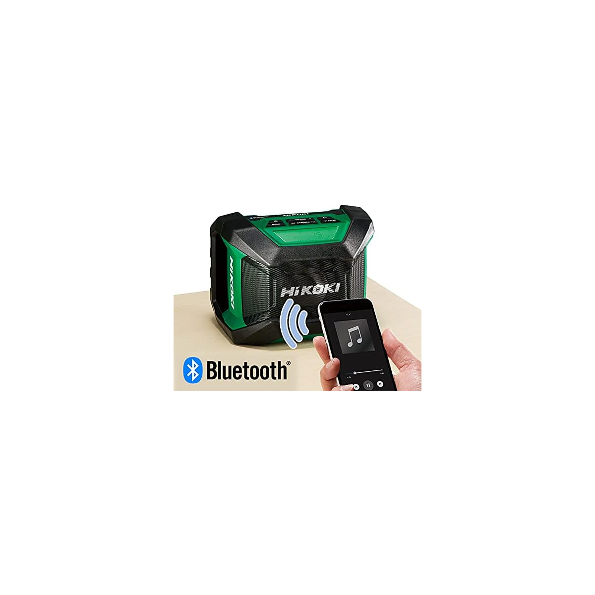 - La connectivité Bluetooth de la radio de chantier Hikoki UR18DAW4Z vous permet d'écouter votre musique préférée ainsi que la radio via leur smartphone ou d'autres appareils portables. L'utilisation du Bluetooth nécessite le couplage des appareils. Un seul appareil peut être connecté à la fois.