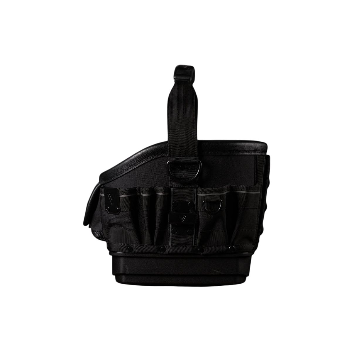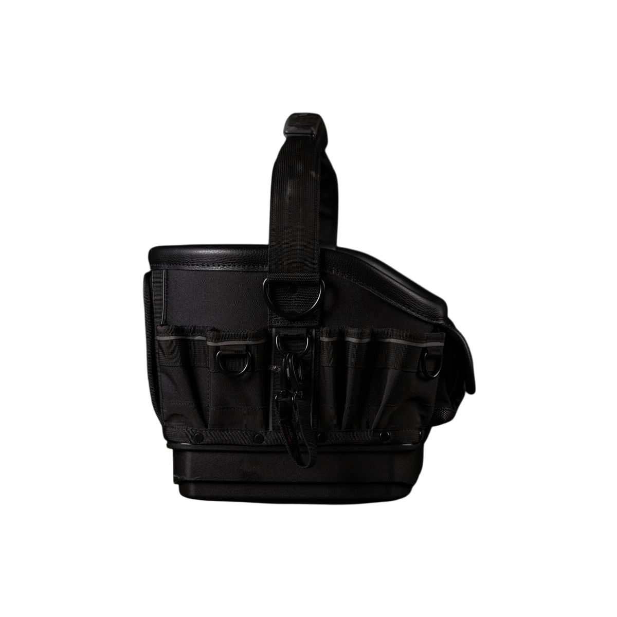 - L'arrière du sac comprend des rangements verticaux dans les coins pour les outils plus volumineux, ainsi qu'une section centrale abritant un bac moulé amovible.