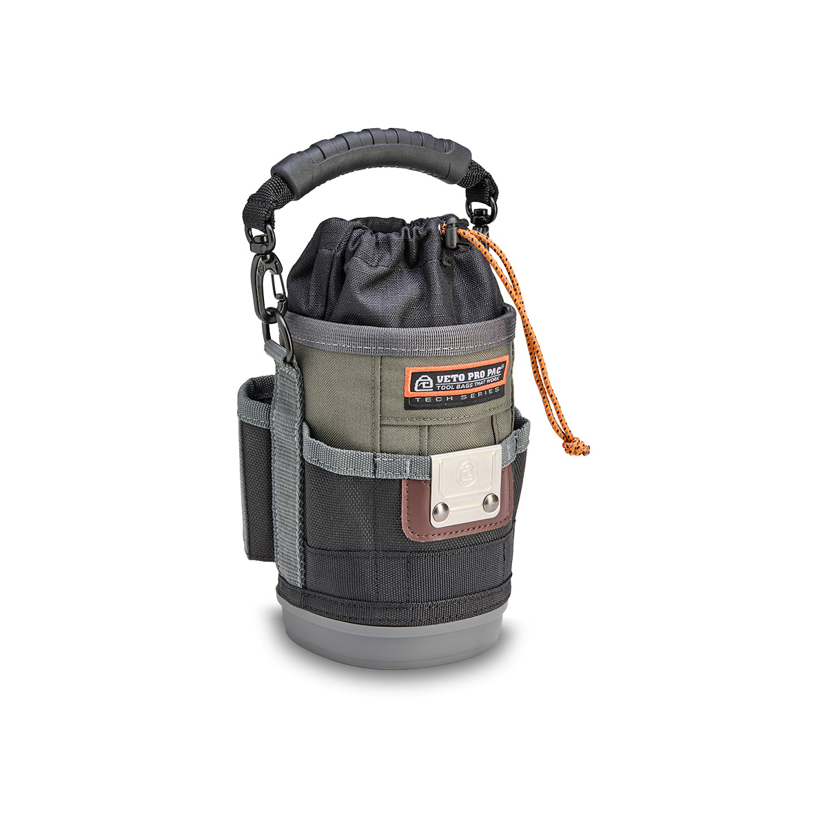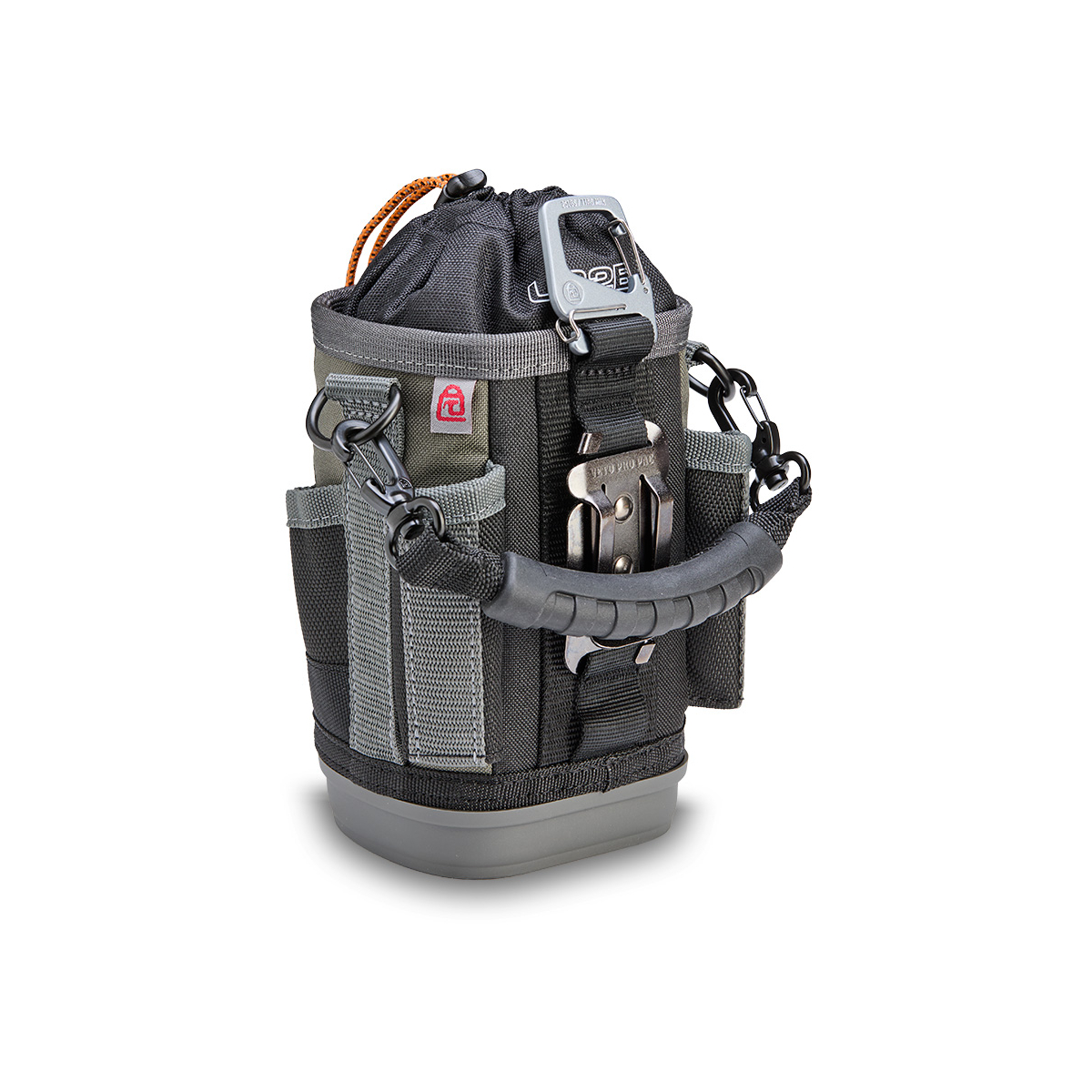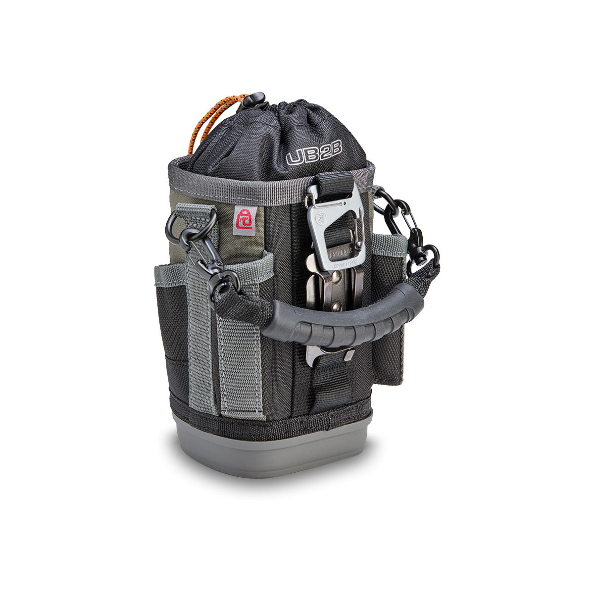- Il est également équipé d'une poignée surmoulée amovible, d'un clip de ceinture repositionnable (RBC) pour fixer le sac à une ceinture ou à une sacoche à outils plus grande, et d'un mousqueton à double doigt pour une fixation alternative.