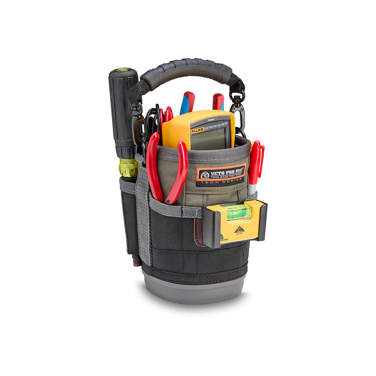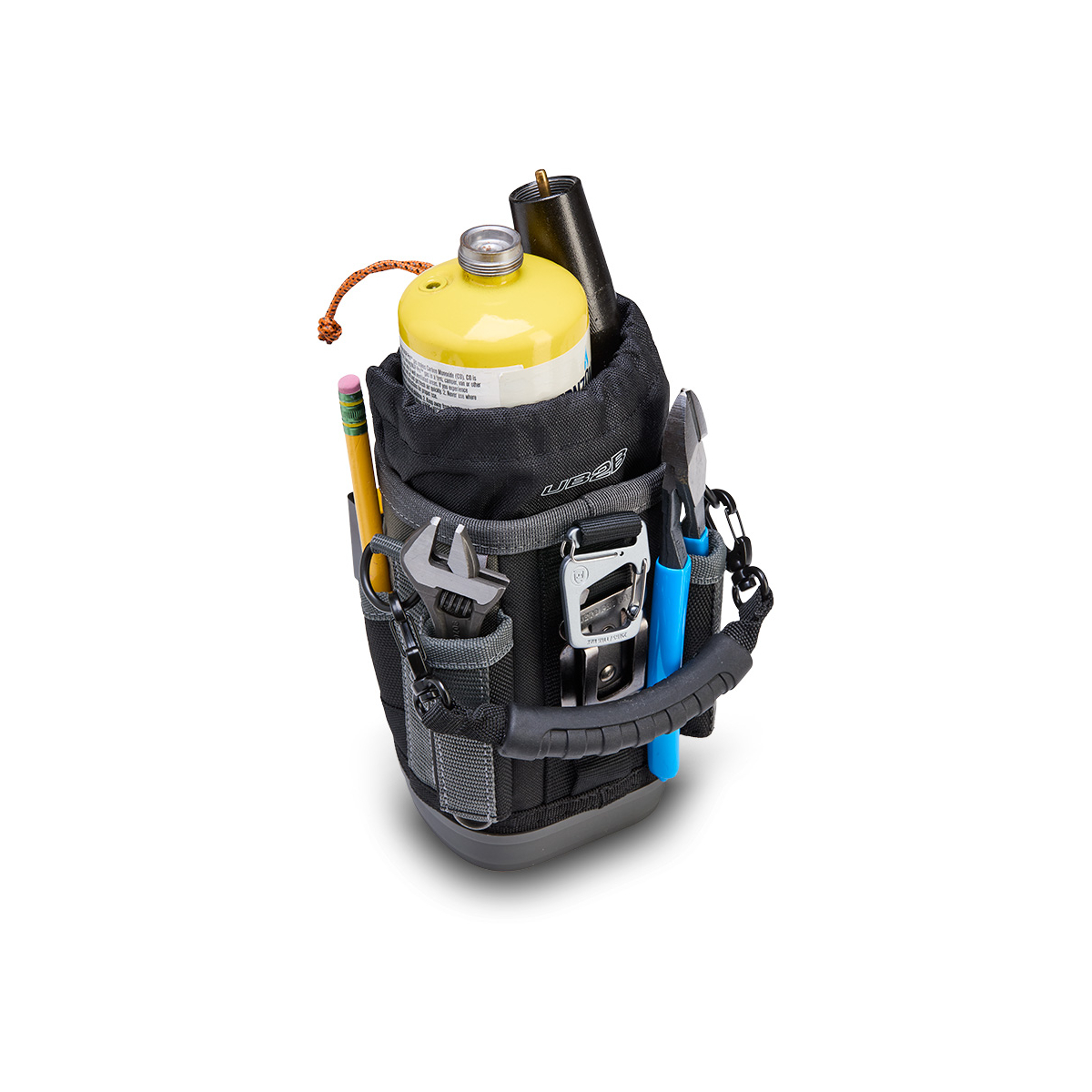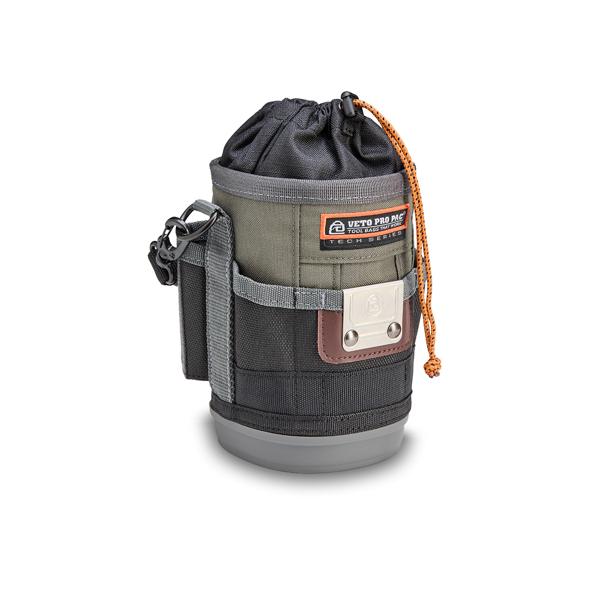 - Il est également équipé d'une poignée surmoulée amovible, d'un clip de ceinture repositionnable (RBC) pour fixer le sac à une ceinture ou à une sacoche à outils plus grande, et d'un mousqueton à double doigt pour une fixation alternative.