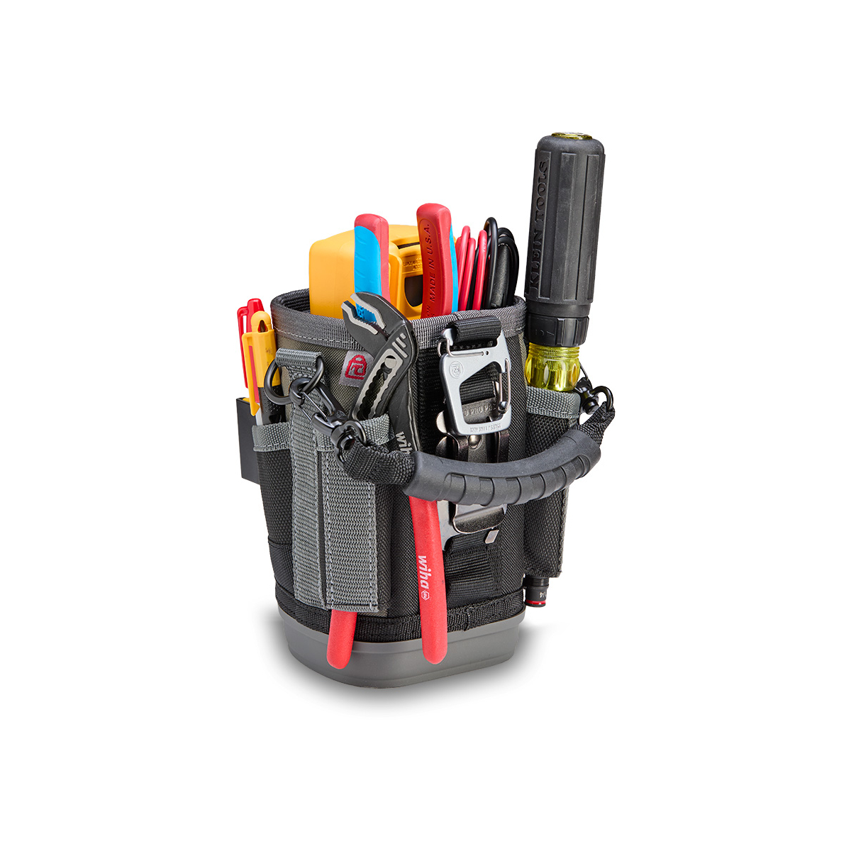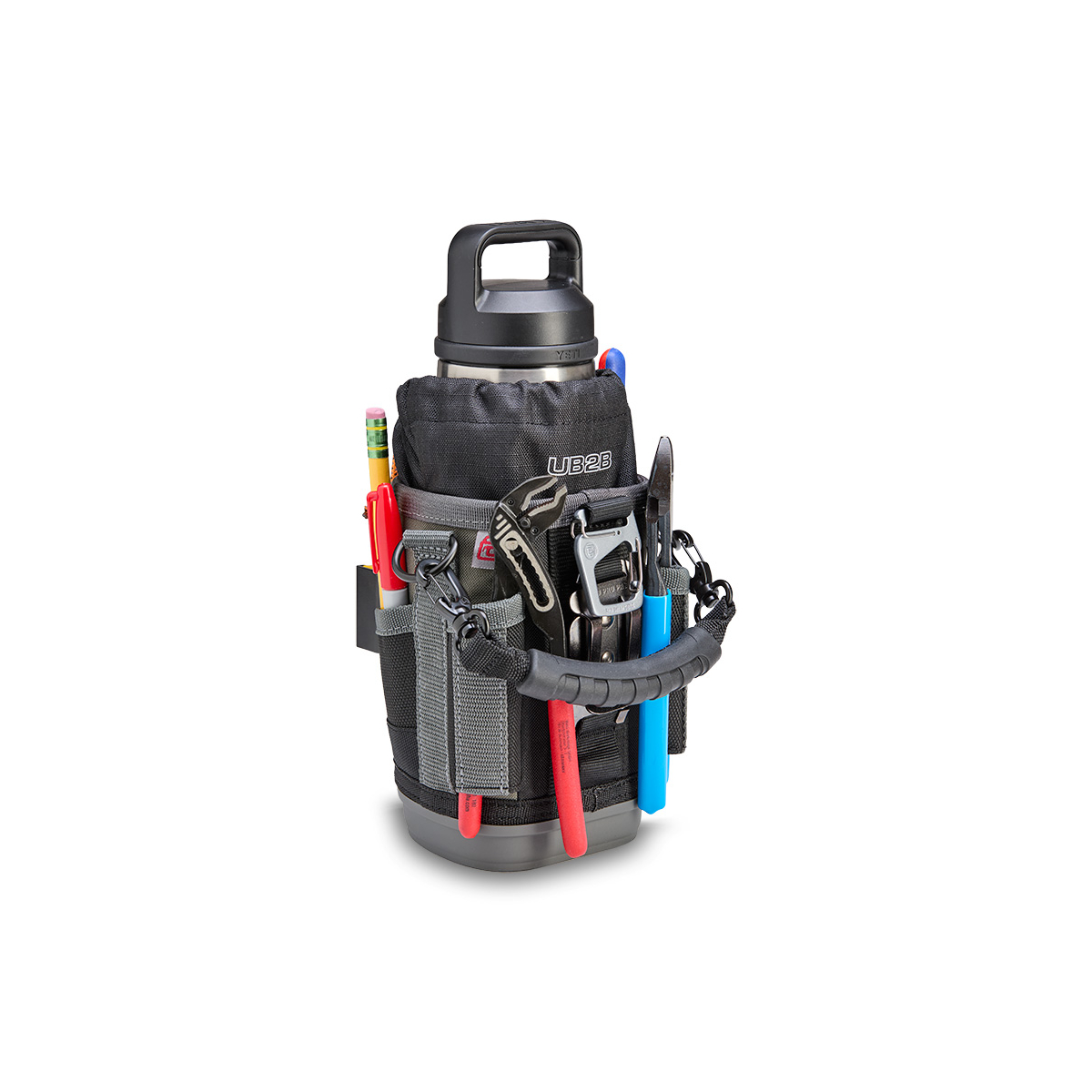 - Conçu pour résister à tous les environnements, il est équipé d'un fond moulé par injection, résistant aux chocs et à l'eau, qui assure sa stabilité. Pour une polyvalence accrue, l'UB2B comprend un clip pour mètre ruban en acier inoxydable et quatre poches extérieures : deux poches traversantes pour les outils longs et deux poches standard pour les petits outils.