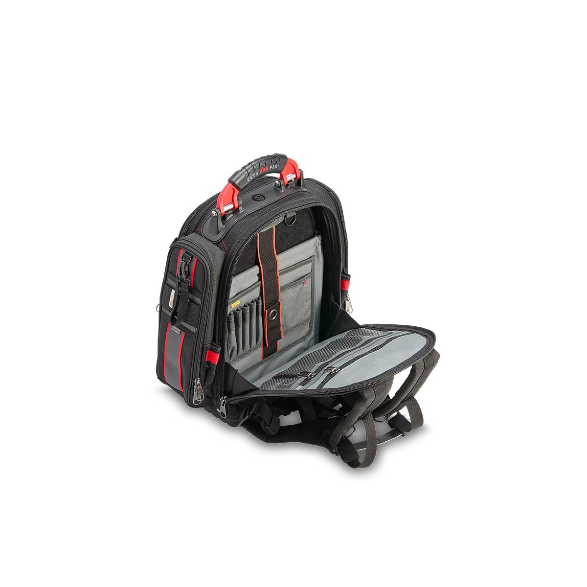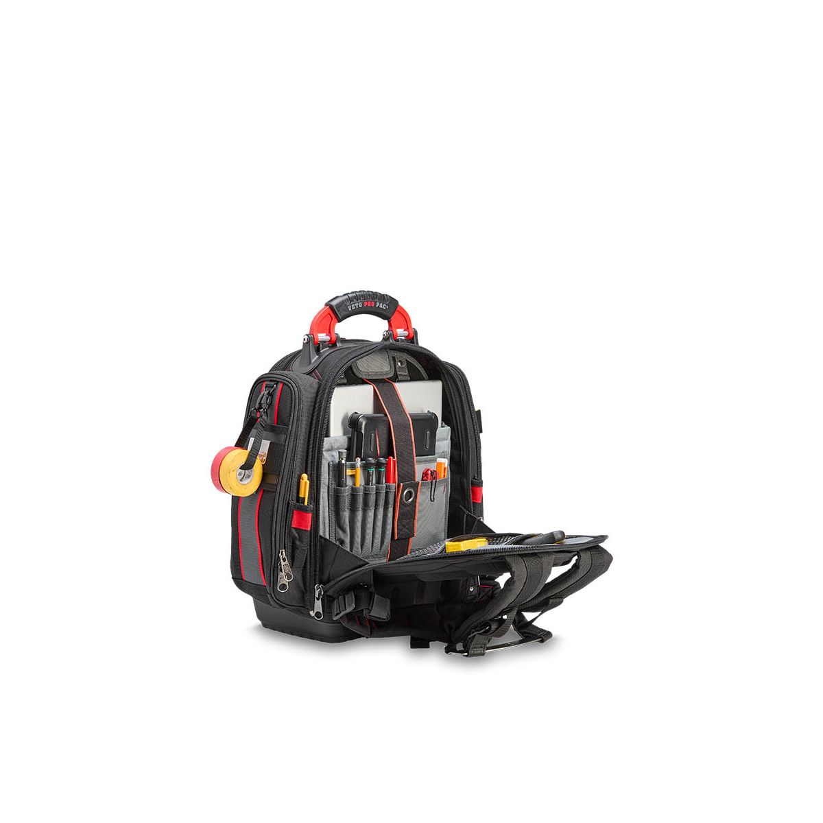 - Le TECH PAC P INFRARED est un grand sac à dos porte-outils arborant le nouveau coloris noir et rouge. Identique au TECH PAC BLACKOUT en termes de conception et de capacité de rangement, il est doté de poches latérales supplémentaires pour ranger séparément un multimètre ou des outils. Chaque poche latérale zippée mesure 33 x 10 x 5 cm. Le sac comprend également des sangles extérieures pour fixer des pochettes et des accessoires, ainsi que des bandes Velcro idéales pour la personnalisation avec des écussons.