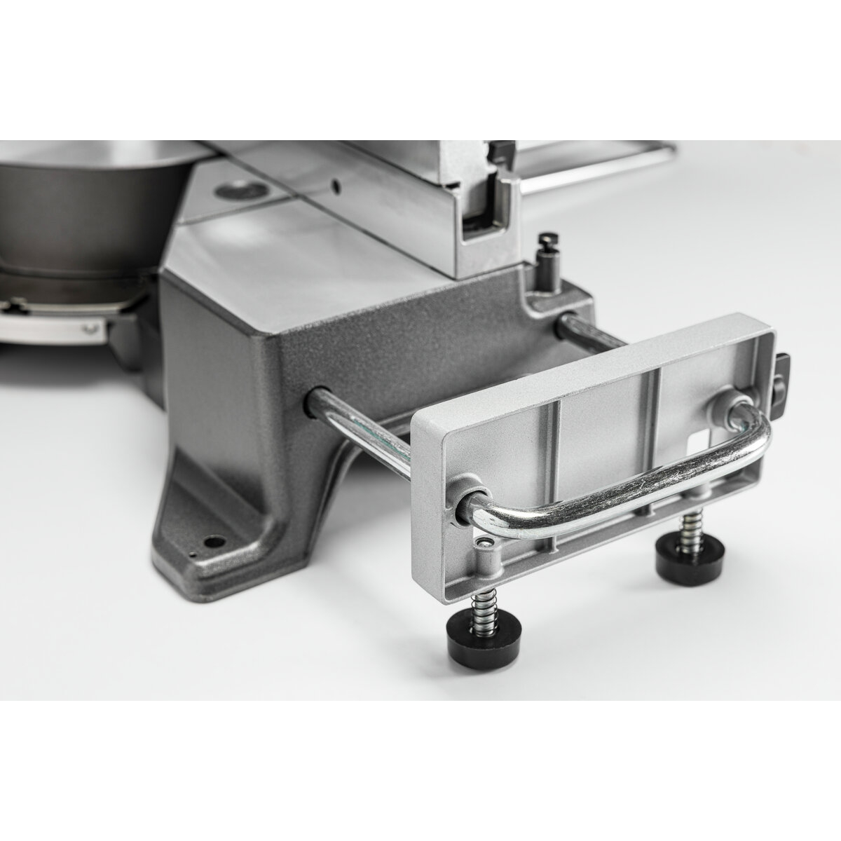 La table s’étend à droite et à gauche, ce qui permet de travailler sur pièces larges tout en conservant une ergonomie adaptée aux chantiers. La règle d’onglet métallique avec neuf butées positives garantit des angles précis et un réglage rapide.