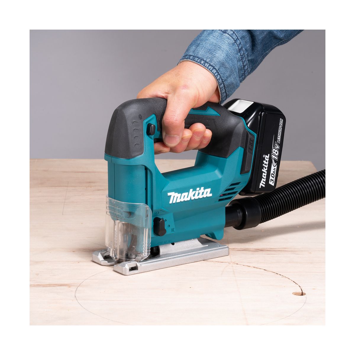 Enfin, la Makita DJV186WVE peut être raccordée à un système d’aspiration externe, permettant de maintenir une zone de travail plus propre et d’améliorer la visibilité de la ligne de coupe.