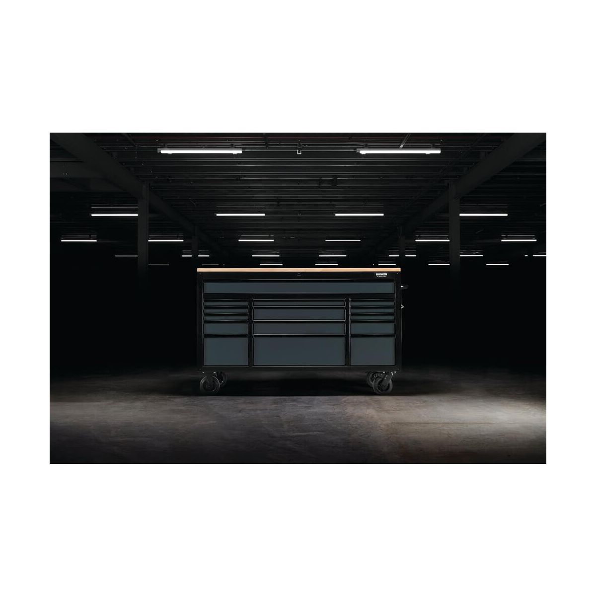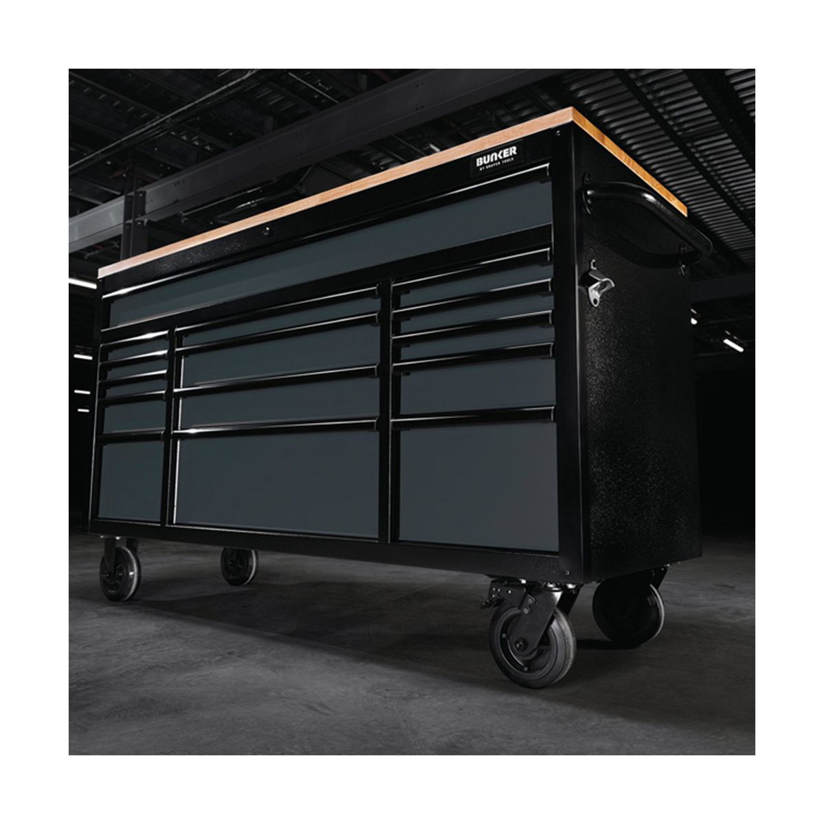 - Envie de transformer votre espace de travail ? L’établi à roulettes BUNKER® de 155 cm (61 po) est doté de 15 tiroirs et offre une solution de rangement de qualité professionnelle. Choisissez parmi les élégants coloris bleu, vert ou gris.