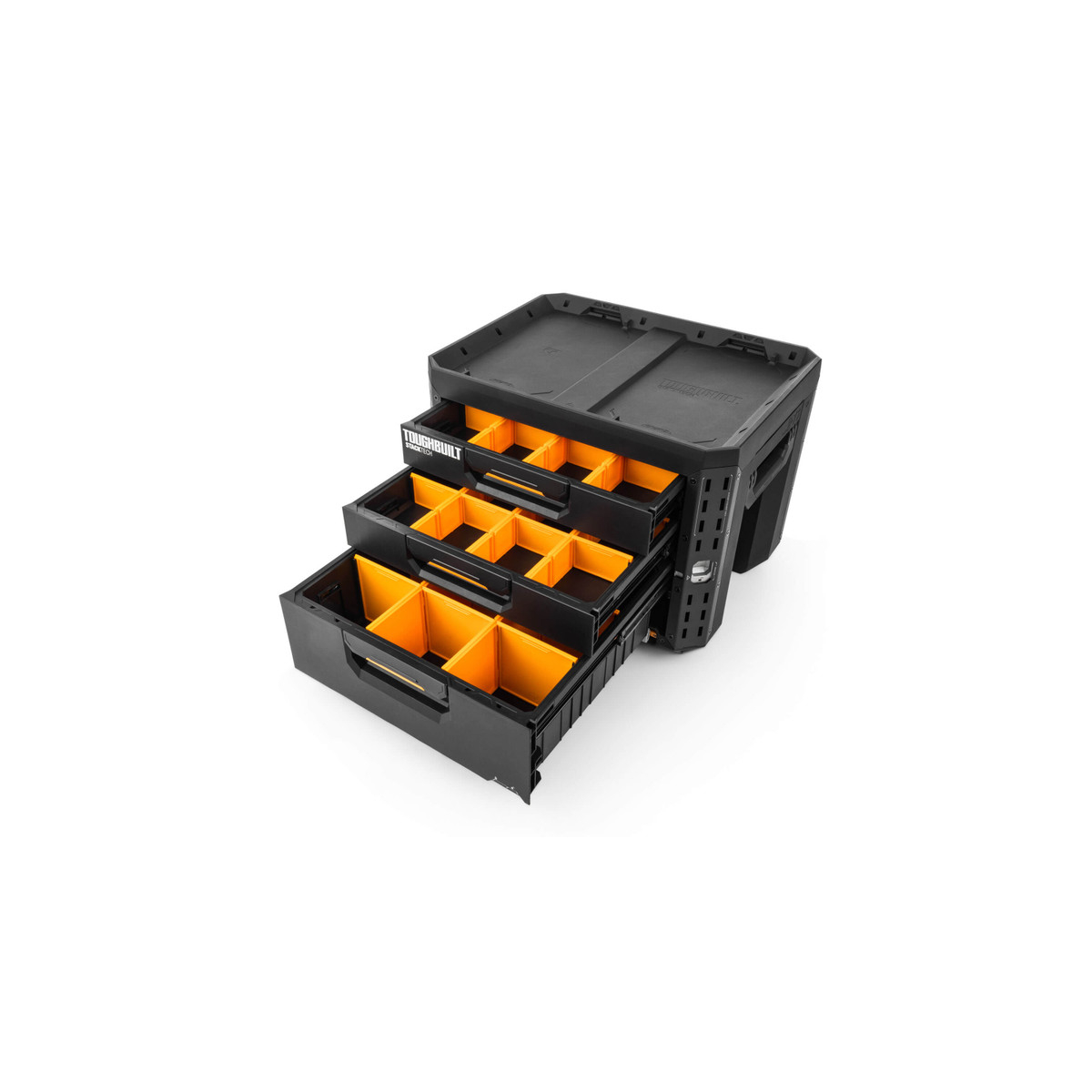 Boîte à outils à 3 tiroirs Toughbuilt TB-B1-D-73 de grande capacité fait partie du système StackTech. Coffret conçue pour supporter jusqu'à 22,6 kilos de poids uniformément réparti.