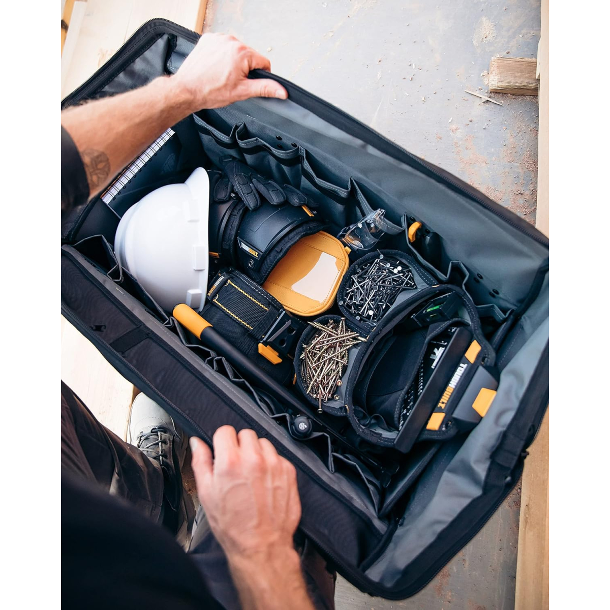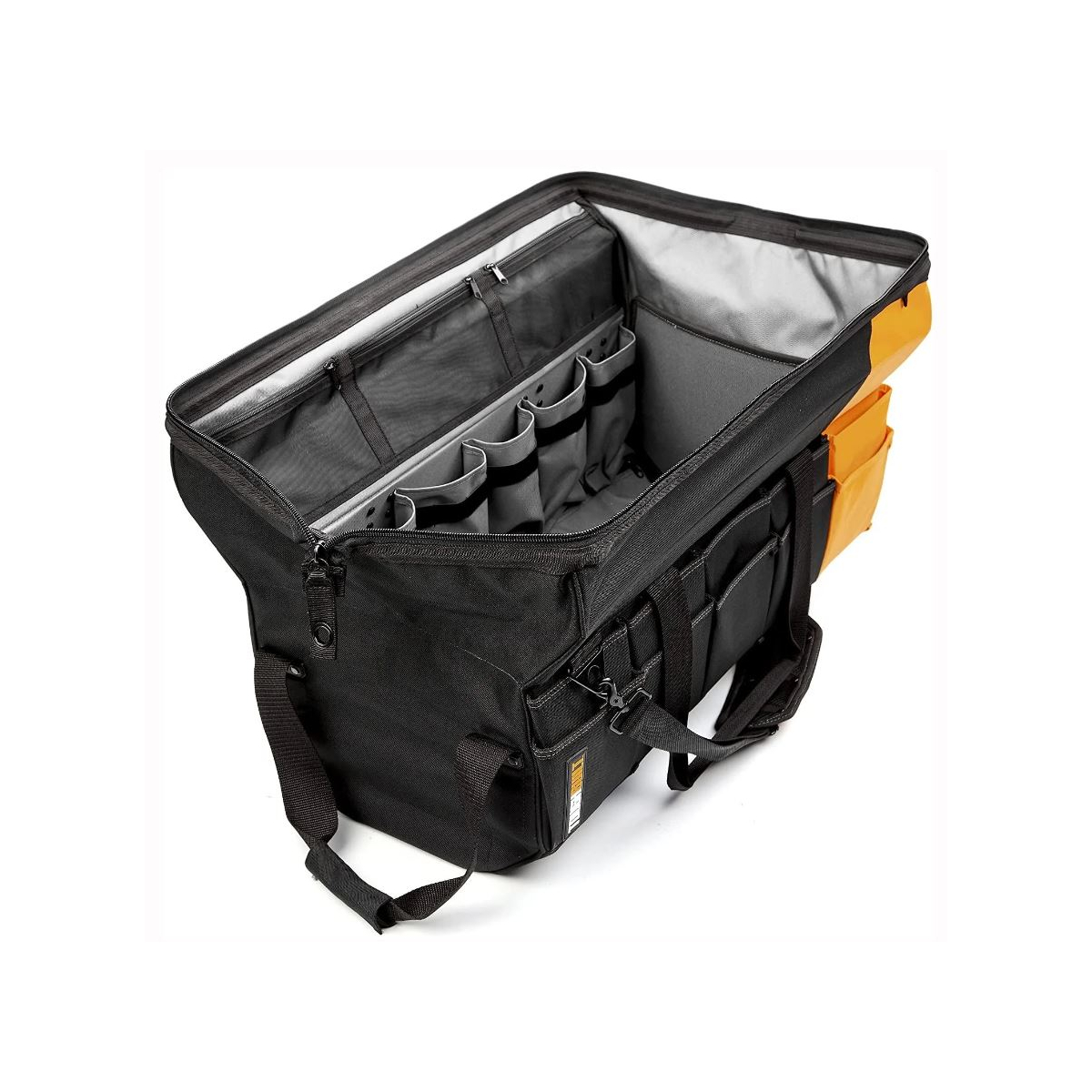 - La forme octogonale unique avec doublure en plastique rigide HardBody™ protège tout à l'intérieur et conserve sa forme. Livré avec une fermeture à glissière verrouillable pour la sécurité et la sécurité. Ses 51 poches et boucles polyvalentes comprennent une poche pour ordinateur portable couverte, des poches externes structurées qui se plient pour maintenir les outils en place en toute sécurité et des poches en filet zippées durables pour plus de visibilité.