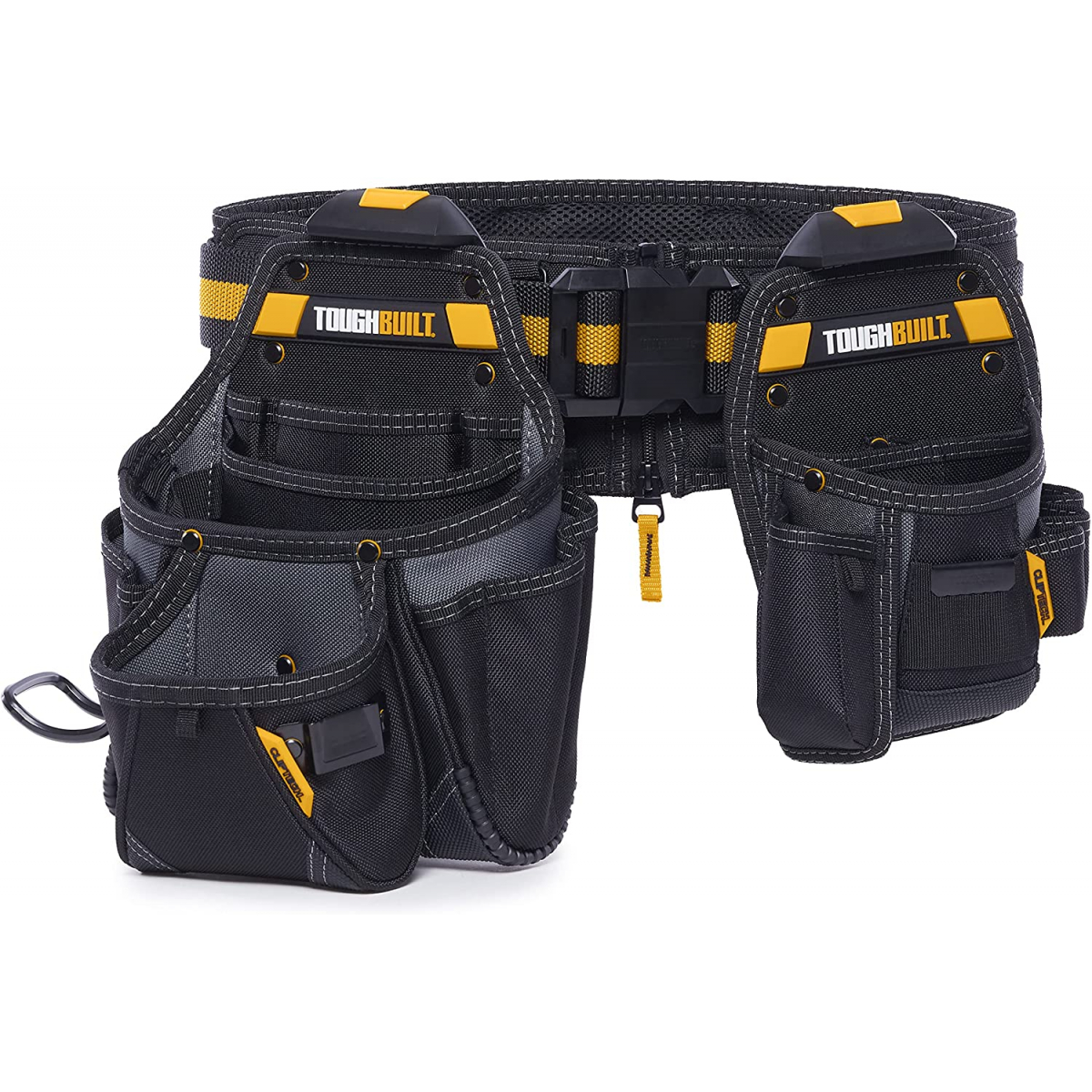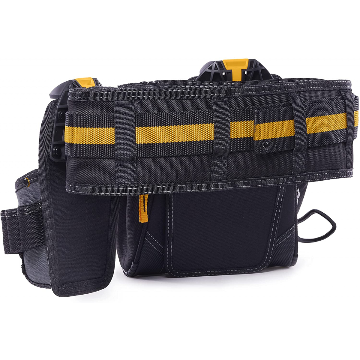 - Cet ensemble comprend 2 pochettes robustes et une ceinture rembourrée avec boucle robuste. Des béquilles intégrées permettent à vos pochettes et outils de se tenir sur le sol ou sur la table à côté de vous. Ses 27 poches et boucles personnalisées comprennent 5 poches de grande capacité avec construction No-Snag Hidden Seam ™, une poche pour ordinateur portable, une boucle pour marteau à usage extrême et 2 pinces à ruban à mesurer. Fabriquée avec une construction robuste à 6 couches et un renfort de rivet, cette ceinture à outils fiable résiste aux conditions de travail les plus difficiles