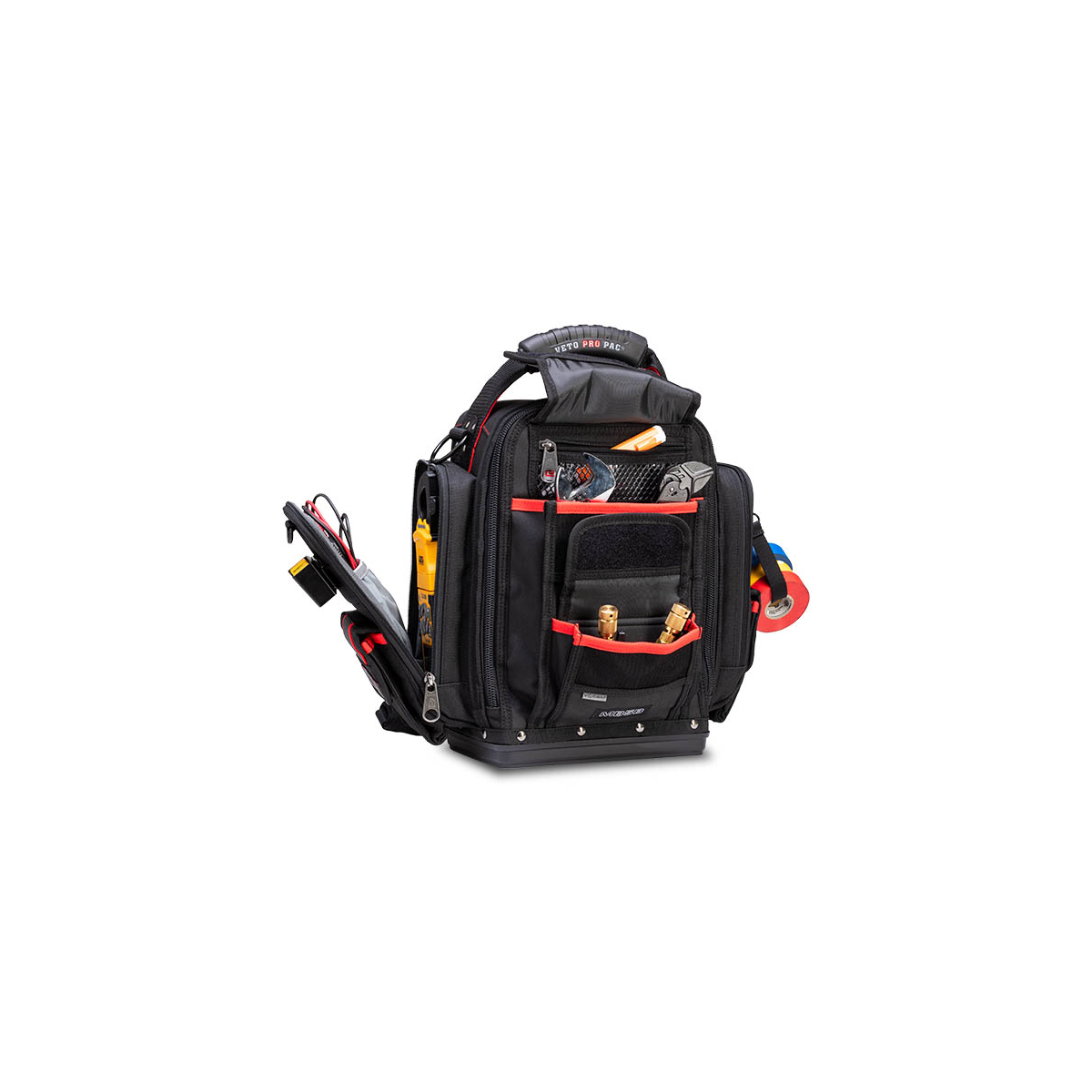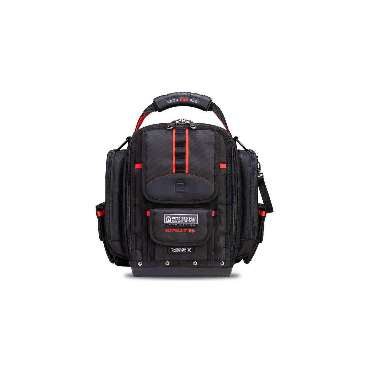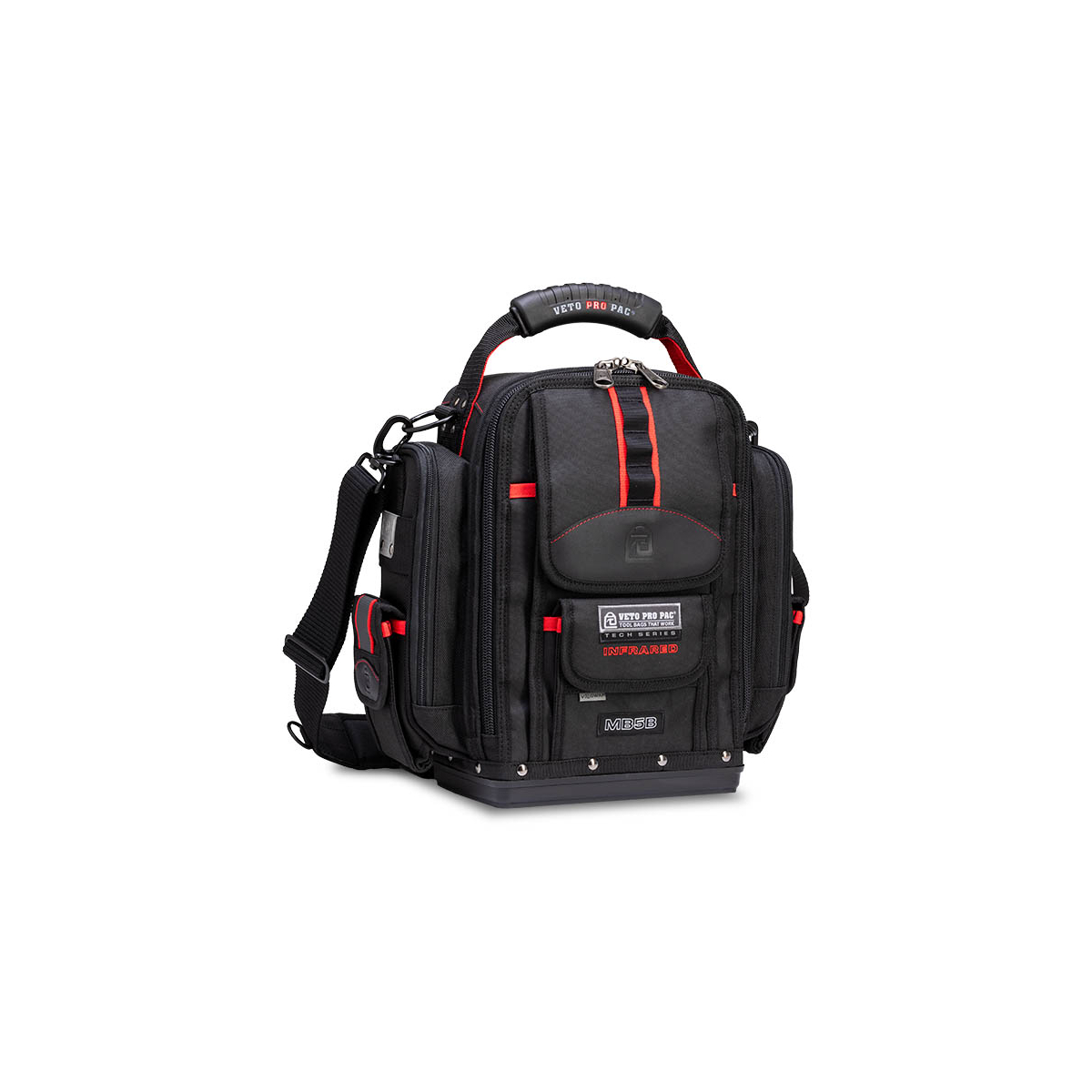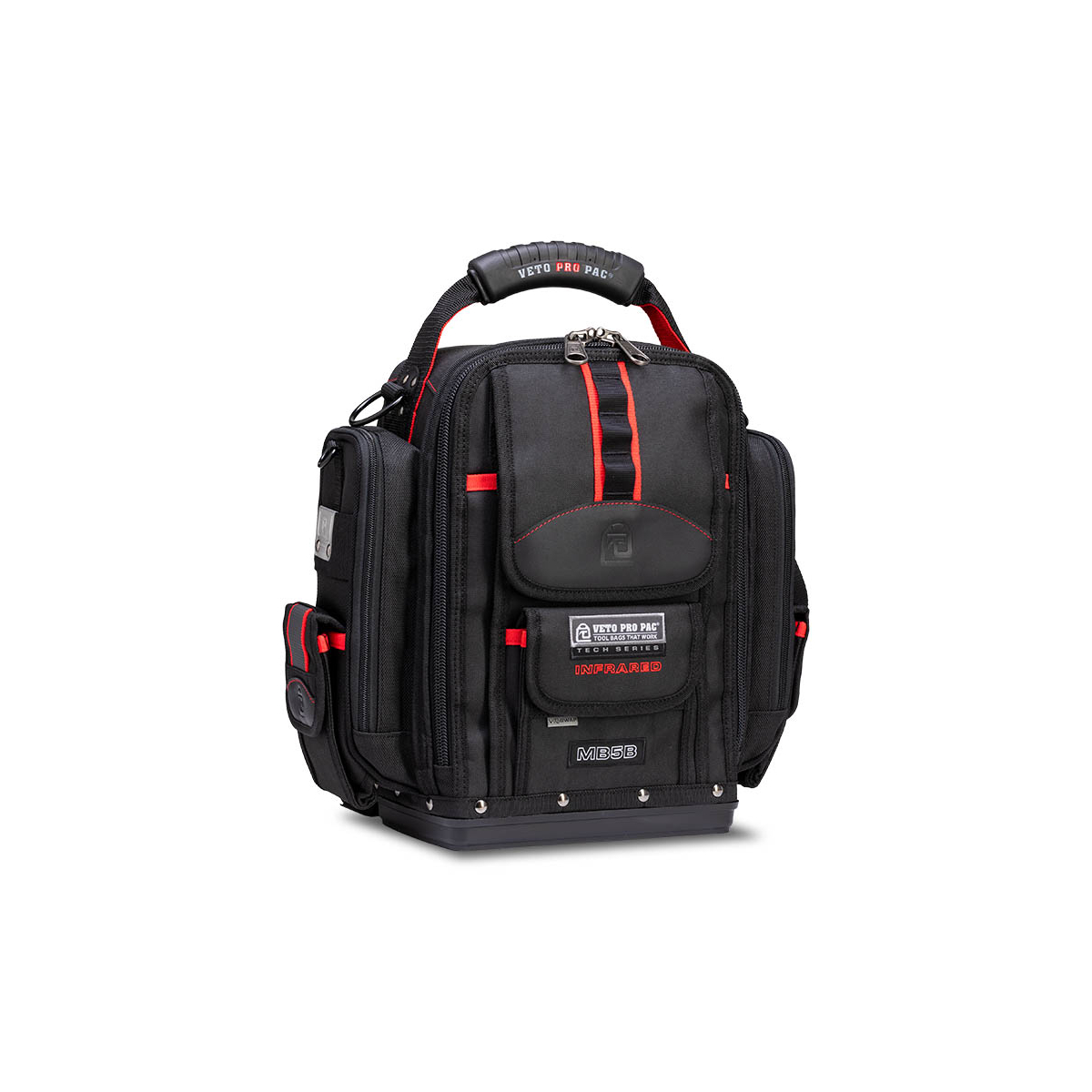 - Le Veto Pro Pac MB5B INFRAROUGE est un sac de mesure extra-large entièrement noir et hautement configurable à accès frontal. Une fois le sac chargé, il peut être porté sur les deux épaules à l'aide des bretelles de sac à dos incluses, sur une seule épaule à l'aide de la bandoulière rembourrée en option (vendue séparément) ou à vos côtés avec une poignée surmoulée. Le sac comprend le système de panneaux interchangeables V-SWAP™ exclusif de Veto et est LIVRÉ AVEC LES GRANDES INSERTIONS DE POCHE LATÉRALE, LE PANNEAU D'OUTILS AVANT ET LE PANNEAU D'OUTILS ARRIÈRE, TOUS COMME ILLUSTRÉ CI-DESSOUS. Des panneaux supplémentaires sont vendus séparément et peuvent être achetés ci-dessous. Le sac comporte 8 poches supplémentaires sur le rabat avant ainsi qu'une poche rembourrée pour tablette à l'arrière. Le MB5B INFRAROUGE permet de ranger une variété d'outils à main à l'intérieur du sac tout en stockant séparément 1 à 2 pinces ampèremétriques dans les 2 poches latérales rembourrées à fermeture éclair.