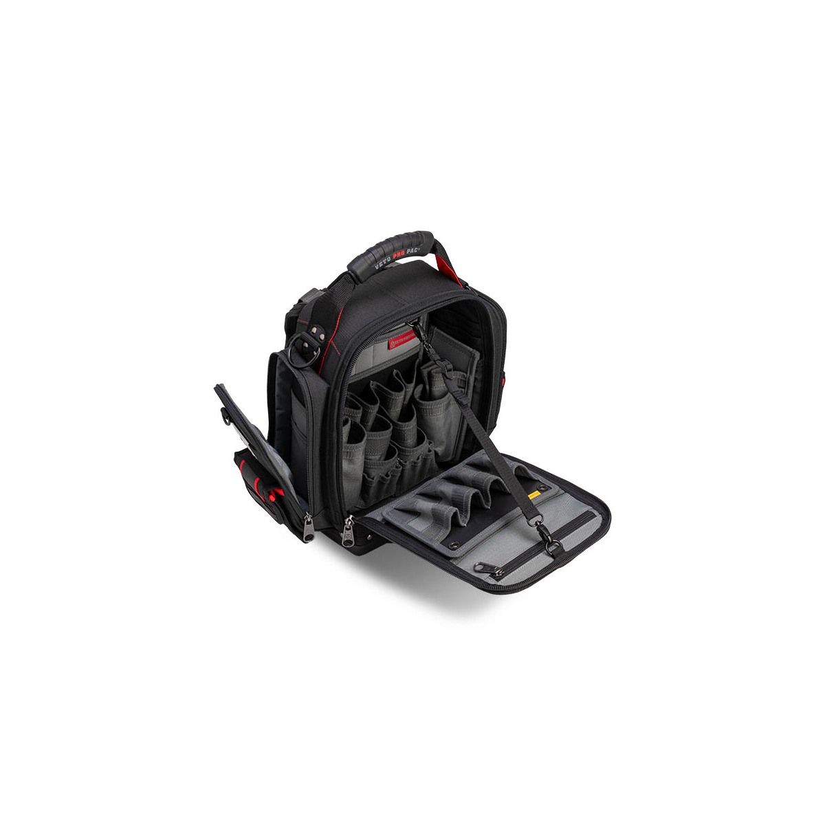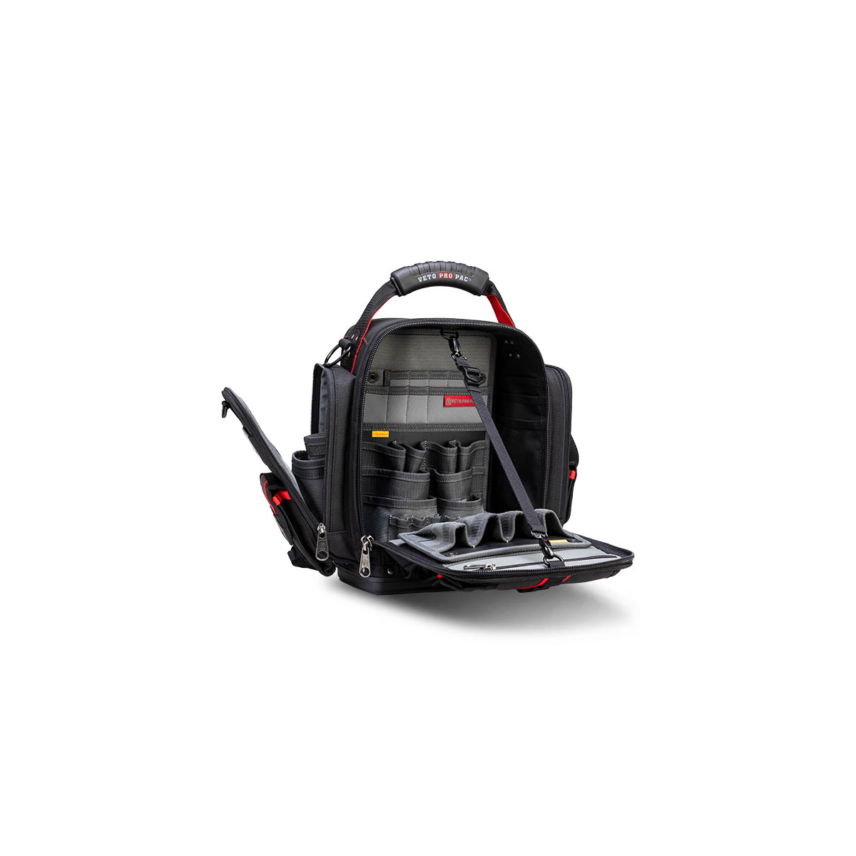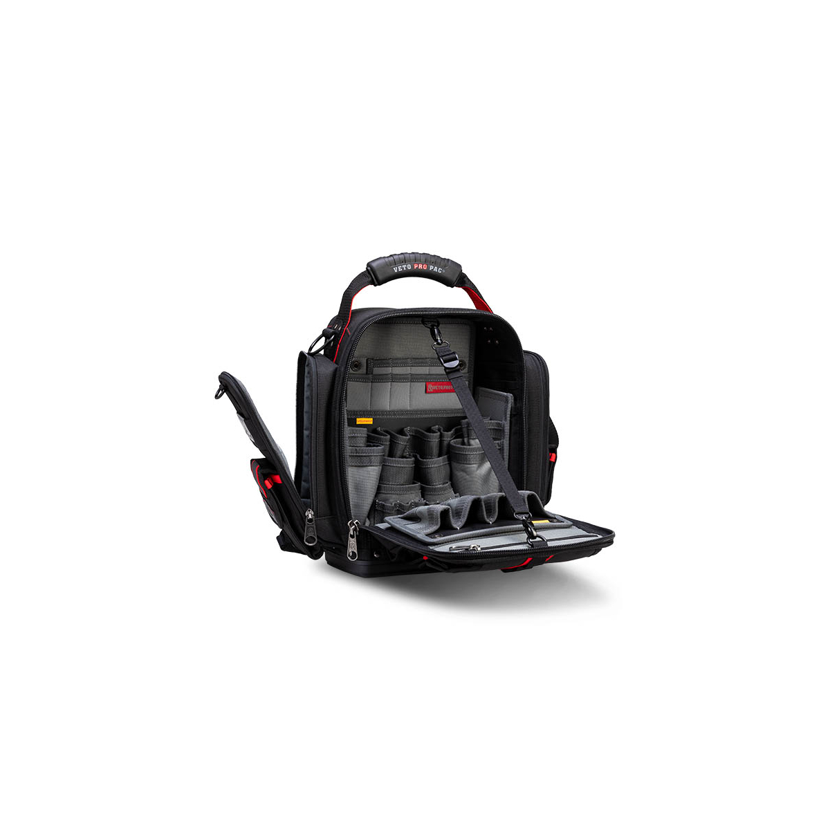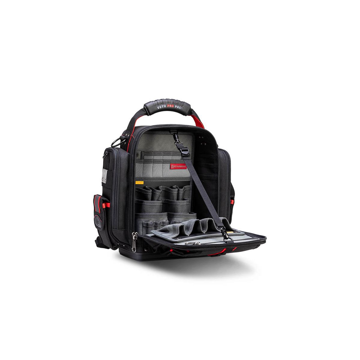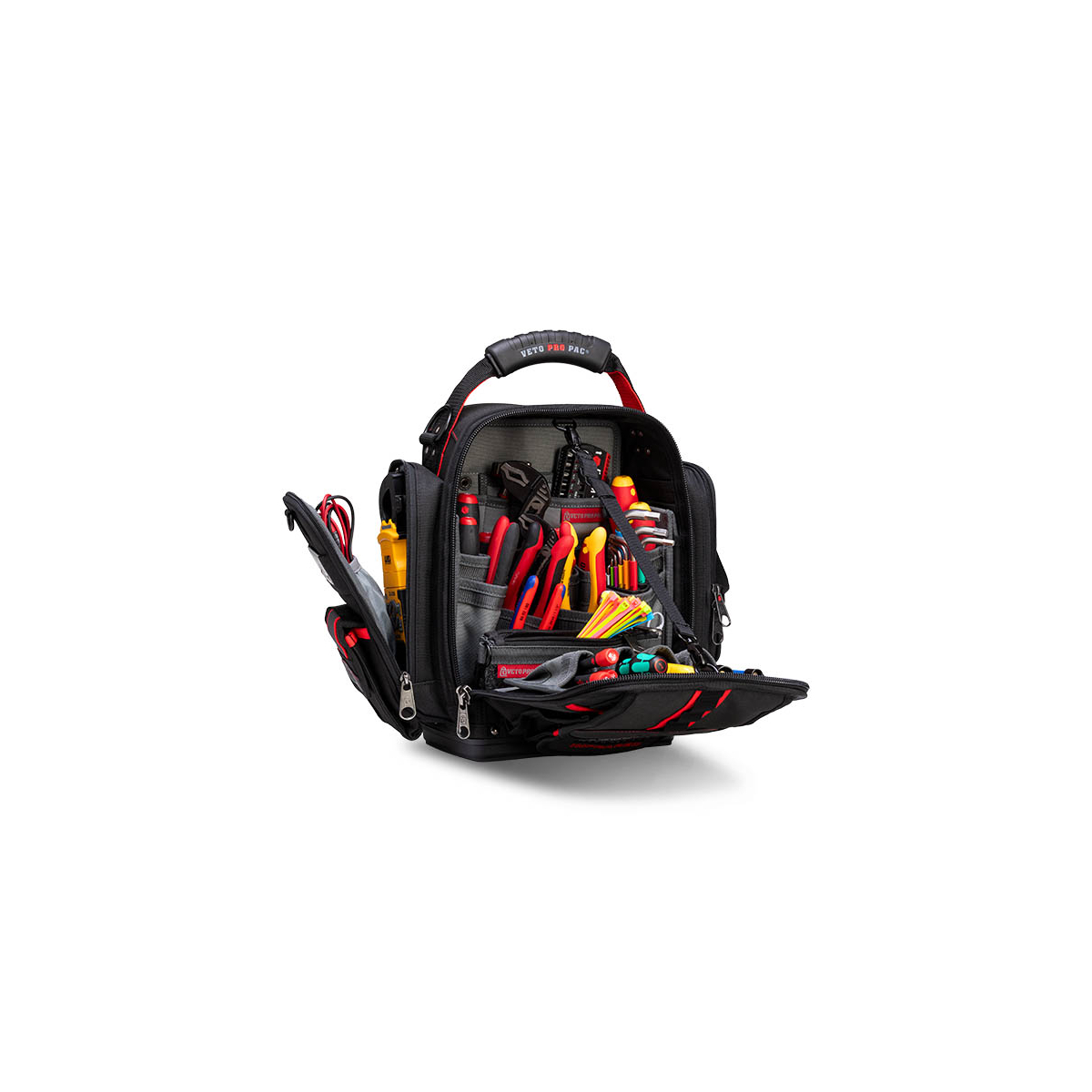 - Le Veto Pro Pac MB5B INFRAROUGE est un sac de mesure extra-large entièrement noir et hautement configurable à accès frontal. Une fois le sac chargé, il peut être porté sur les deux épaules à l'aide des bretelles de sac à dos incluses, sur une seule épaule à l'aide de la bandoulière rembourrée en option (vendue séparément) ou à vos côtés avec une poignée surmoulée. Le sac comprend le système de panneaux interchangeables V-SWAP™ exclusif de Veto et est LIVRÉ AVEC LES GRANDES INSERTIONS DE POCHE LATÉRALE, LE PANNEAU D'OUTILS AVANT ET LE PANNEAU D'OUTILS ARRIÈRE, TOUS COMME ILLUSTRÉ CI-DESSOUS. Des panneaux supplémentaires sont vendus séparément et peuvent être achetés ci-dessous. Le sac comporte 8 poches supplémentaires sur le rabat avant ainsi qu'une poche rembourrée pour tablette à l'arrière. Le MB5B INFRAROUGE permet de ranger une variété d'outils à main à l'intérieur du sac tout en stockant séparément 1 à 2 pinces ampèremétriques dans les 2 poches latérales rembourrées à fermeture éclair.