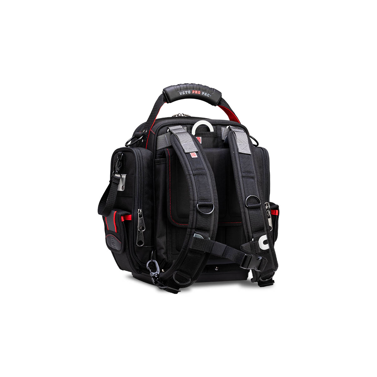 Le sac à outils Veto Pro Pac MB5B INFRARED (INFRAROUGE) de taille extra-large à accès frontal, il peut être porté sur les deux épaules à l’aide des bretelles incluses ou sur une seule épaule à l'aide de la bandoulière.
