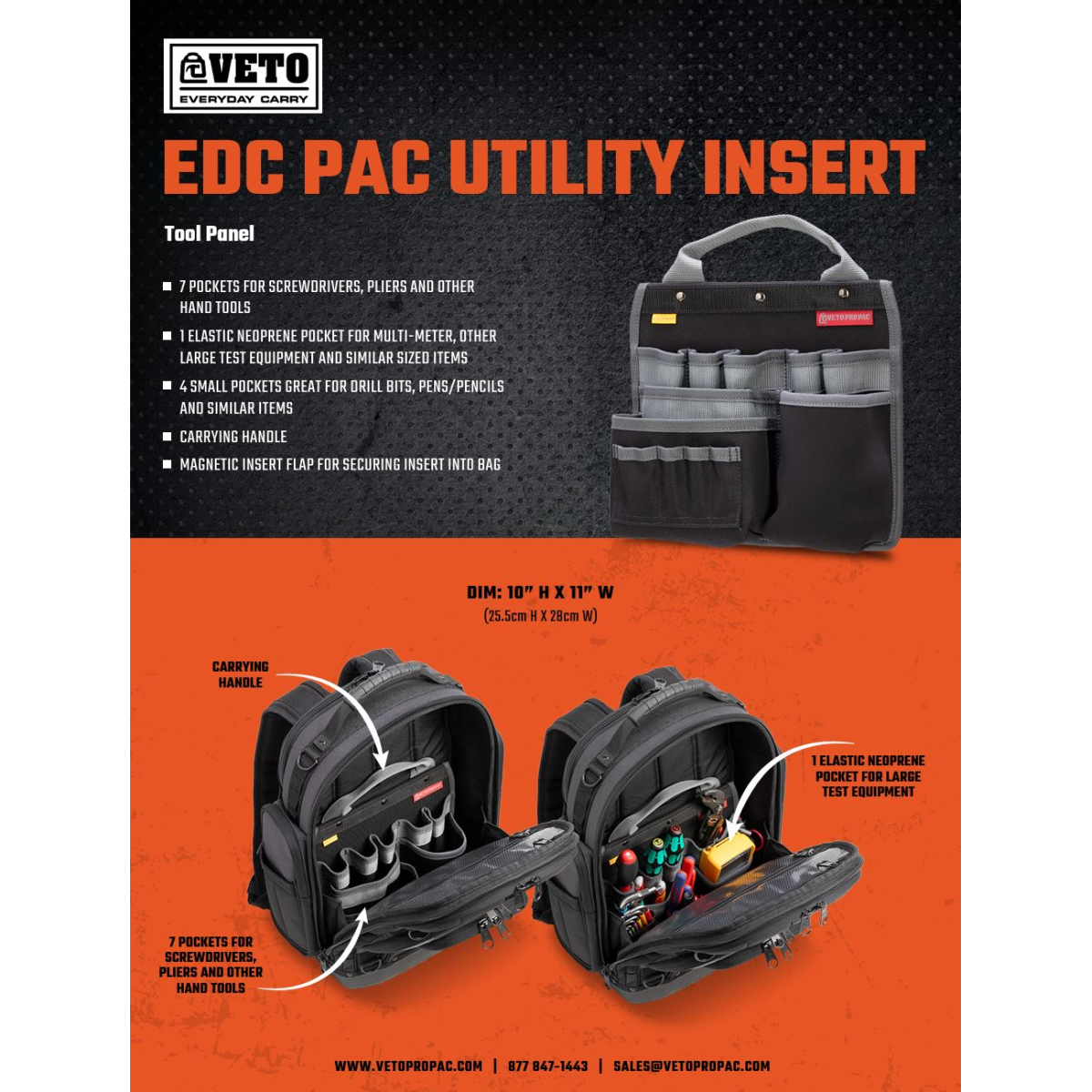 Le nouveau panneau utilitaire EDC PAC (panneau à outils) est un panneau V-SWAP™ à 12 poches qui permet de transformer le sac à dos EDC PAC en un porte-outils pratique, idéal pour transporter du matériel de test et autres accessoires. Ce panneau est parfait pour ceux qui souhaitent emporter des outils dans leur sac EDC PAC LCB lorsqu'ils se rendent sur un chantier ou partout où des outils peuvent s'avérer utiles.